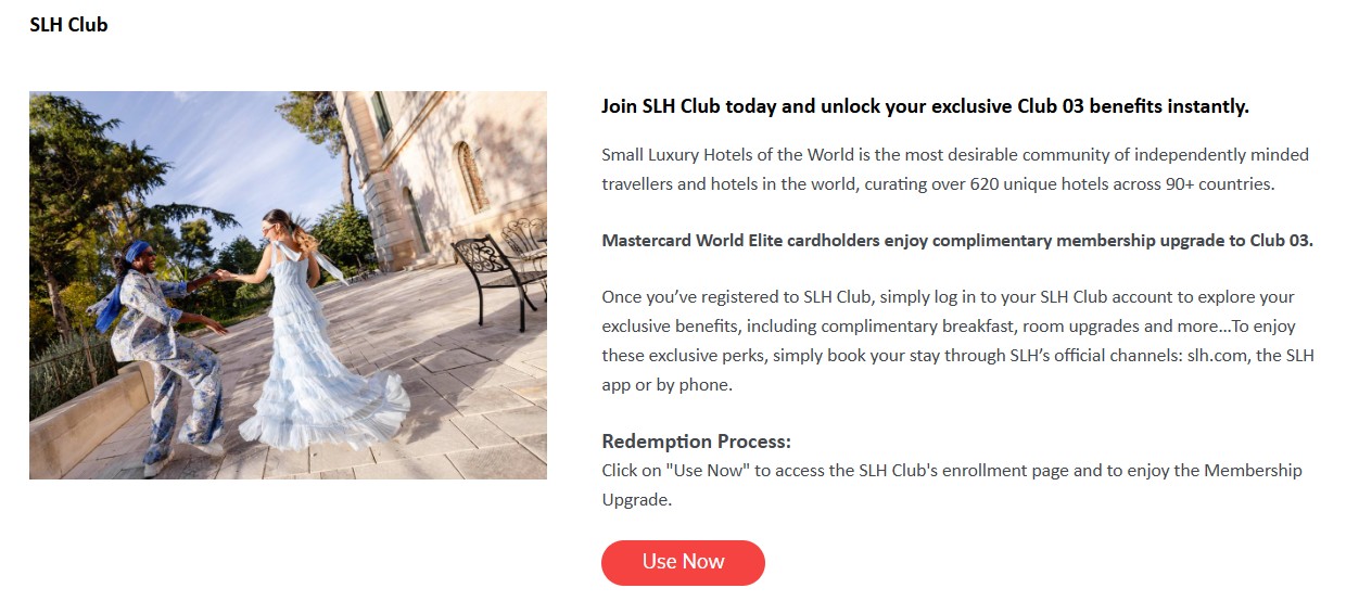 - Log in to the Mastercard Redemption Portal and look for the SLH Club membership benefit.