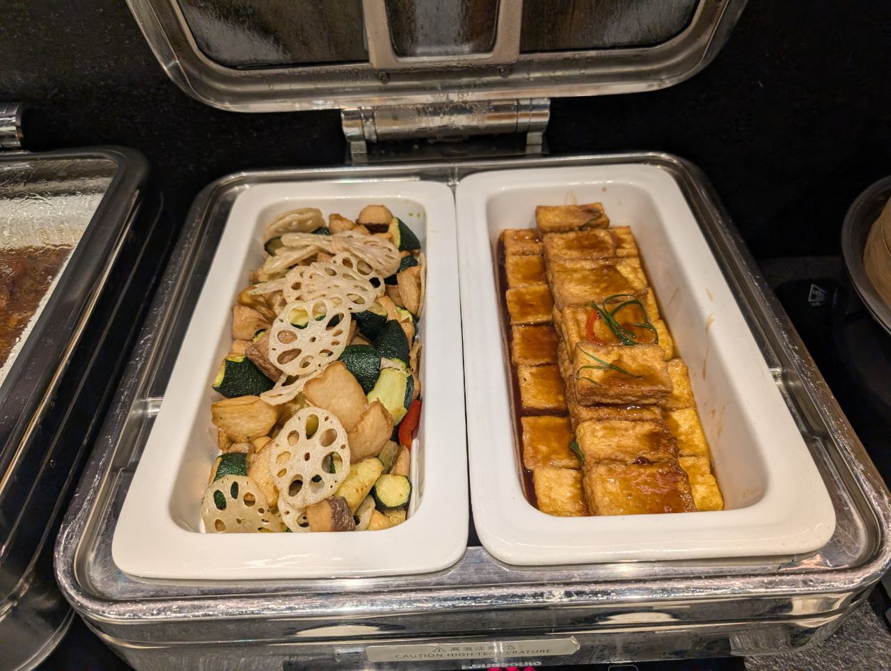 Hot items included hot dogs, dim sum, and cooked items in food warmers such as tofu, lotus root and mixed vegetables, and a very unappetising-looking chicken dish.