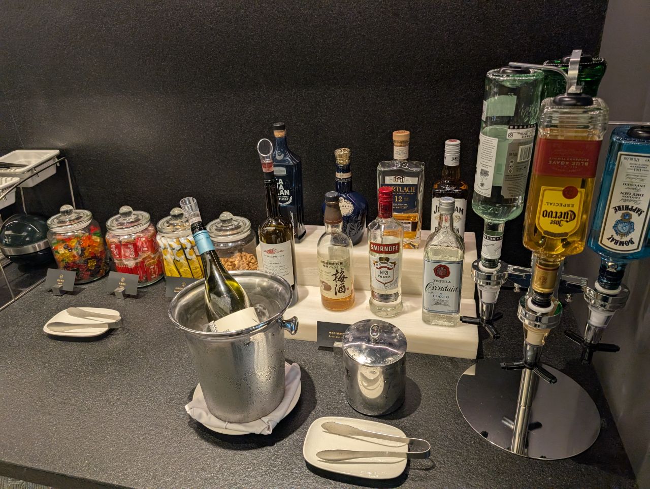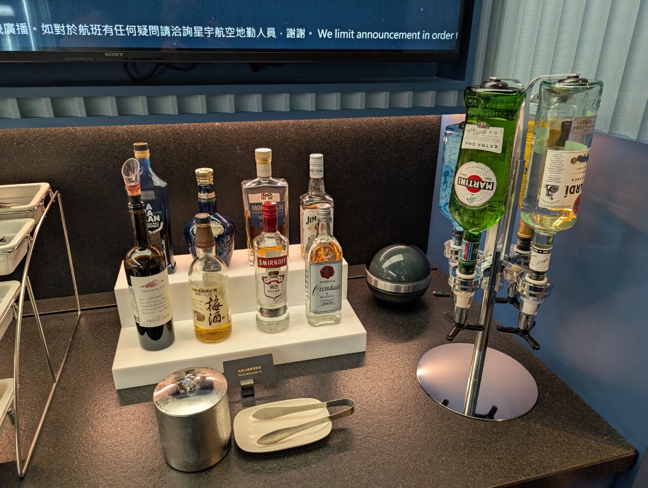 Self-pour spirits included Kavalan whisky, Jim Beam bourbon, Bombay Sapphire gin, and Jose Cuervo tequila. Surprisingly for an airline which keeps harping on the premium aspect, there was no champagne in the lounge (that said, I don’t believe EVA or China Airlines offer champagne in their lounges either). In fact, there was just a choice of one red and one white, and neither particularly great. I also found it amiss that there was no bartender service, given STARLUX’s excellent onboard cocktails.