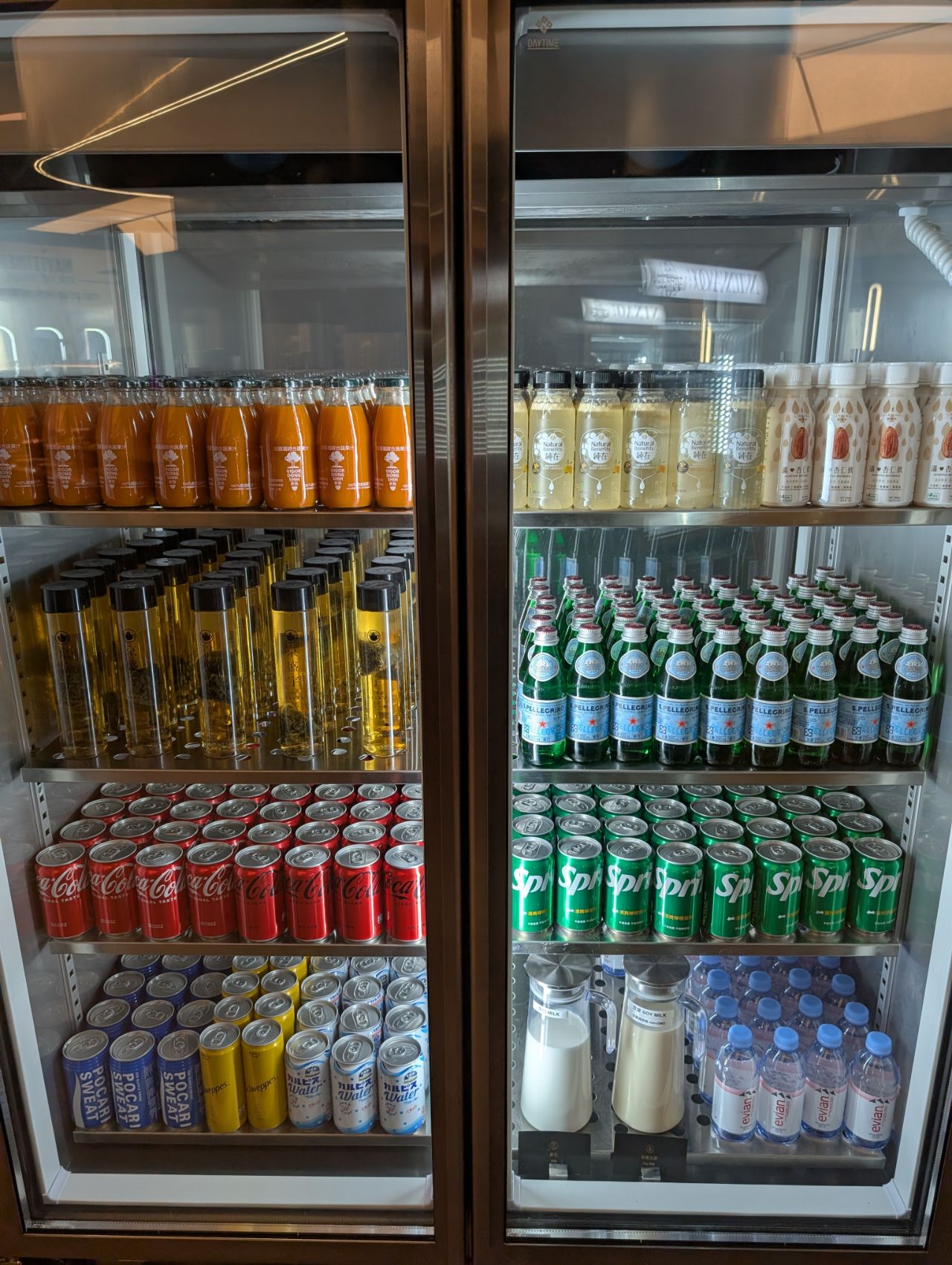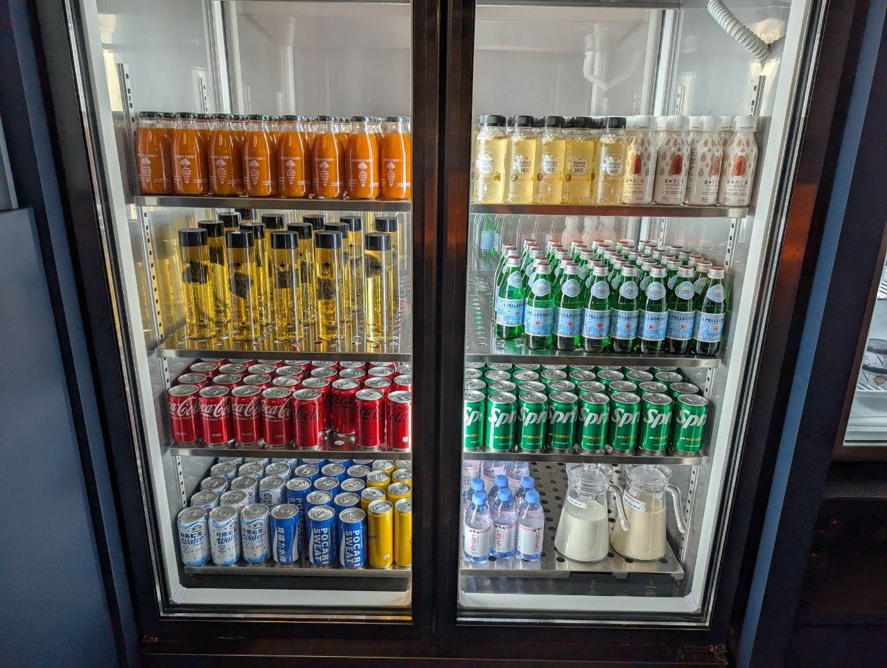 The fridges were well-stocked with various beverages including Evian and San Pellegrino water, local teas and juices (though nothing can beat STARLUX’s onboard drinks selection).