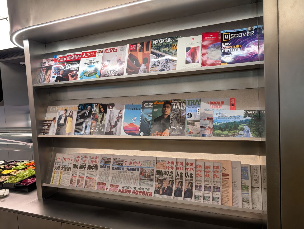 There was also a literature rack with newspapers and magazines. Offering physical reading materials is a nice touch in an age where so many lounges have “enhanced” them away.