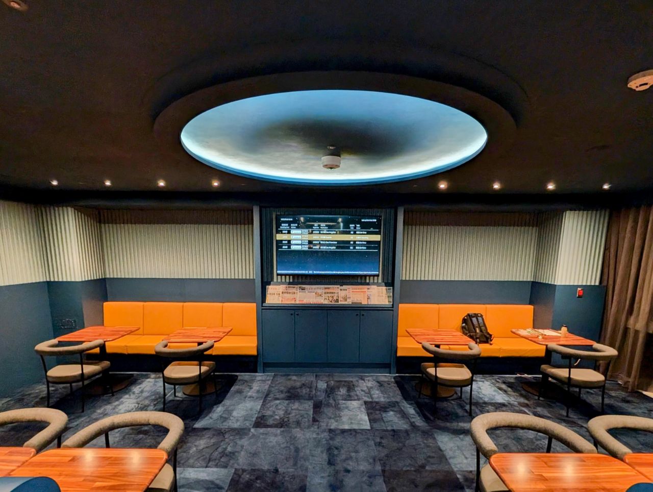 The quietest parts of the lounge could be found at either end of the lower floor, isolated from the activity and busyness of the terminal. Above the seating annexes were circular tray ceilings with cove lighting, reminiscent of the lunar surface.