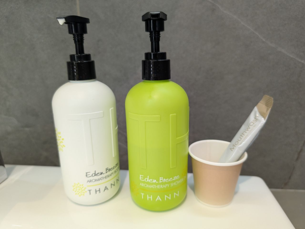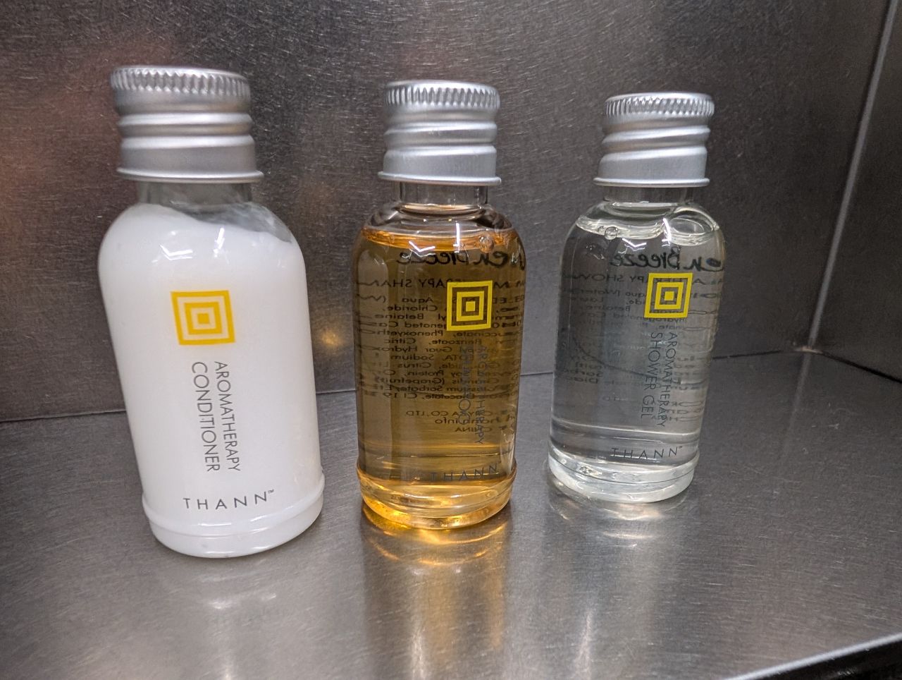Small bottles of Thann brand shampoo, shower gel and conditioner were provided, which was a bit strange given that the hand soap and body lotion were in bulk-sized dispensers.