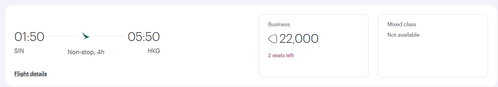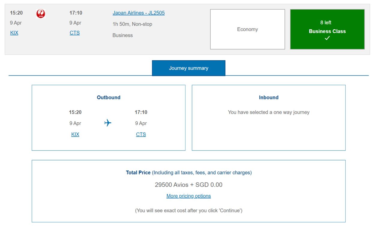 Honestly, at these rates you’d probably be better off buying the cheapest Economy Class fare you can find and then redeeming Max Miles to get reimbursed via FlyAnywhere (at 1.8 cents per mile). For example, the KIX-CTS flight shown above would cost 12,500 Avios for an Economy redemption, versus 6,000 Max Miles if you were to buy a cash ticket (S$108/0.018).