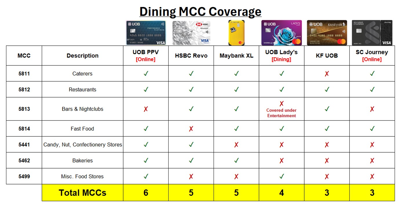 Within the Dining category, the UOB Preferred Platinum Visa has the widest MCC coverage (and remember, if you’re spending offline then it becomes a blacklist card).