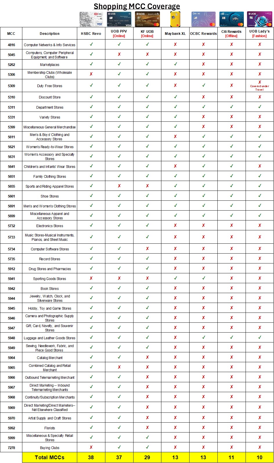 For the shopping category, the HSBC Revolution and UOB Preferred Platinum Visa offer the most MCC coverage by far (it’s somewhat ironic that despite being marketed as shopping cards, the OCBC Rewards, Citi Rewards and UOB Lady’s Card have scant coverage of this category!).