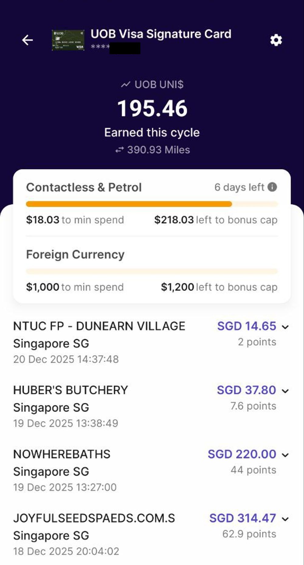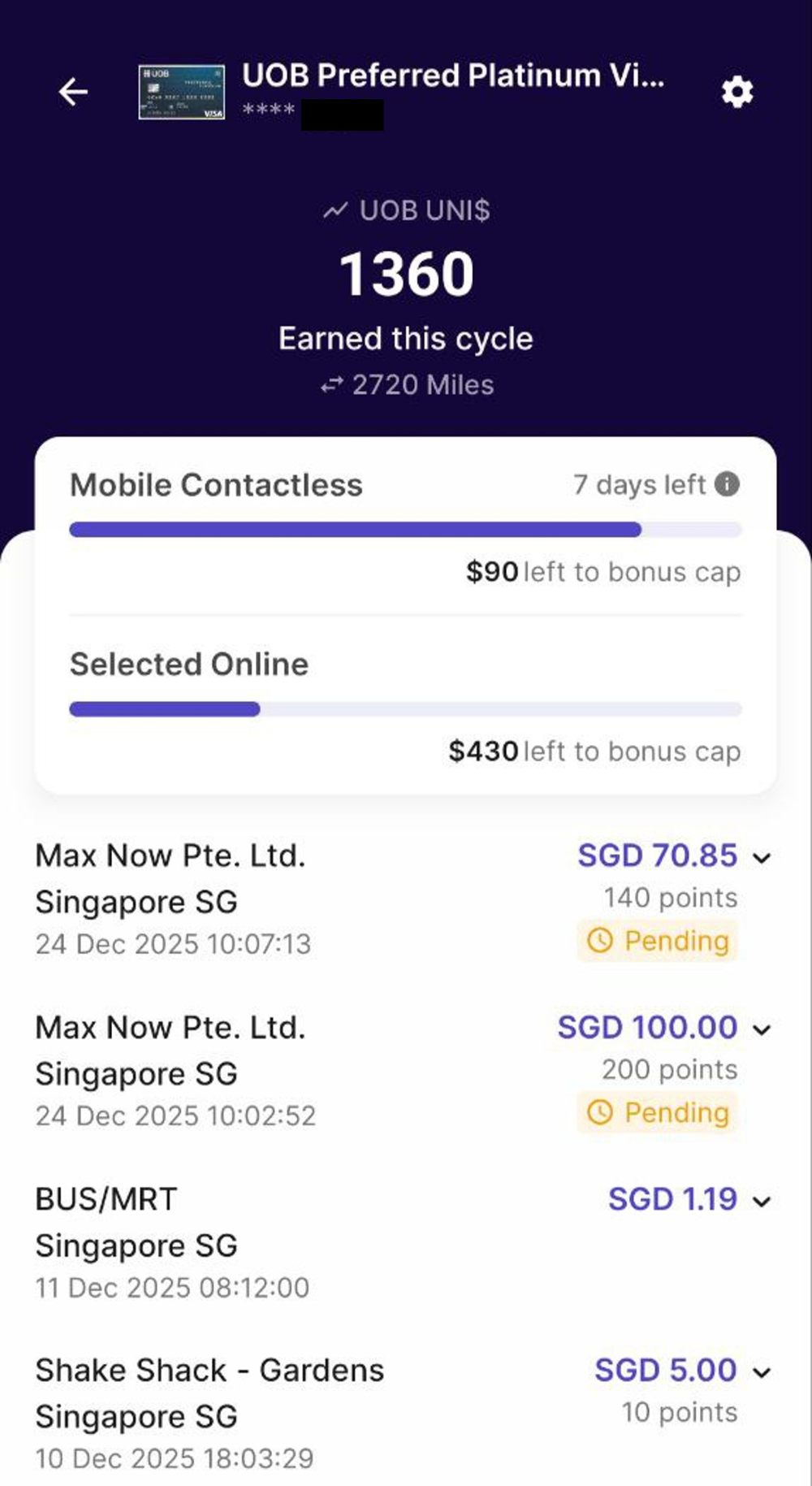 The bonus cap resets at the end of each calendar month, so as of today, 24 December 2025, I have seven days of spending left to go (probably slightly less, since UOB tracks bonus caps based on posting date, not transaction date, and transactions take time to post).