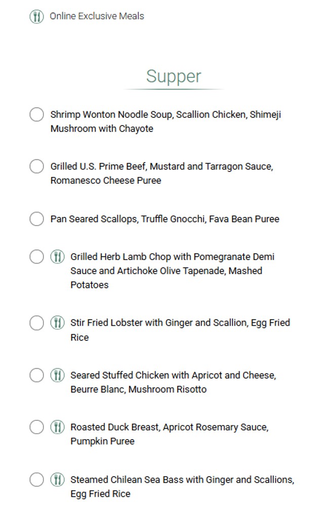 Business Class passengers can pre-order their meal online between 21 days and 24 hours before departure, which includes some options that aren’t available onboard (denoted by the fork and spoon icon).