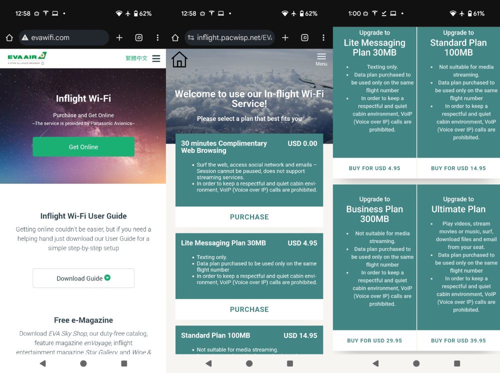 If you’re in Business Class, you’ll enjoy free unlimited web browsing, period. However, if you’re in Premium Economy or Economy, you must attach an EVA Air frequent flyer membership to your ticket to enjoy unlimited web browsing, or unlimited texting, if you’re a Silver/Green member in Economy.