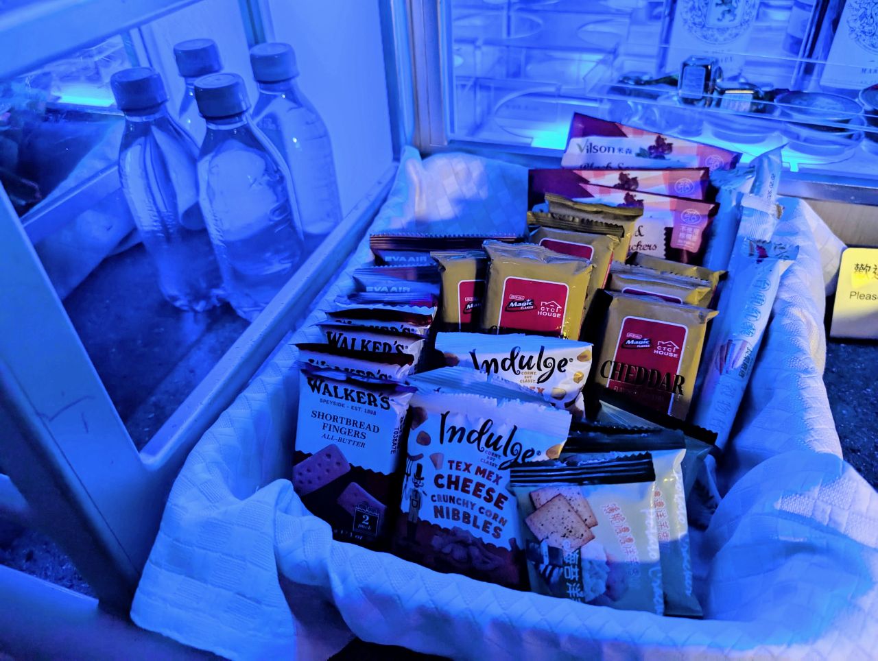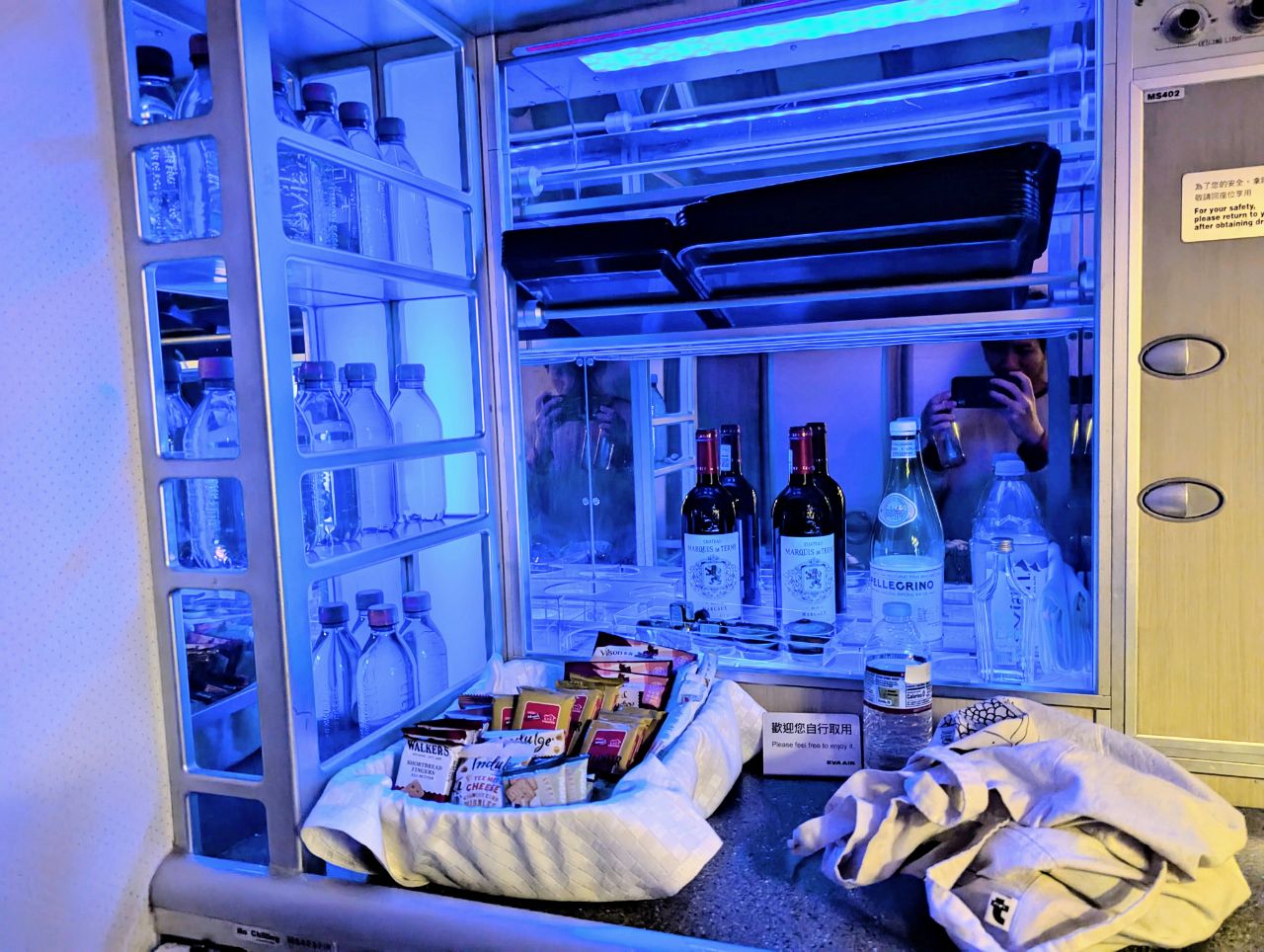 A snack station was set up in the middle galley, with help-yourself bottles of Evian together with biscuits, cheese, dried fruits and corn nibbles.