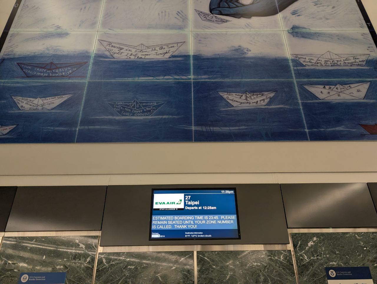 Boarding for BR27 from San Francisco to Taipei started on time, 15 minutes before midnight.