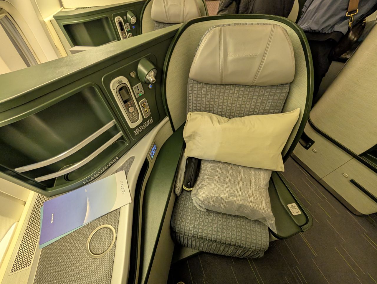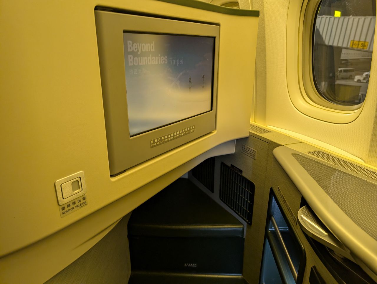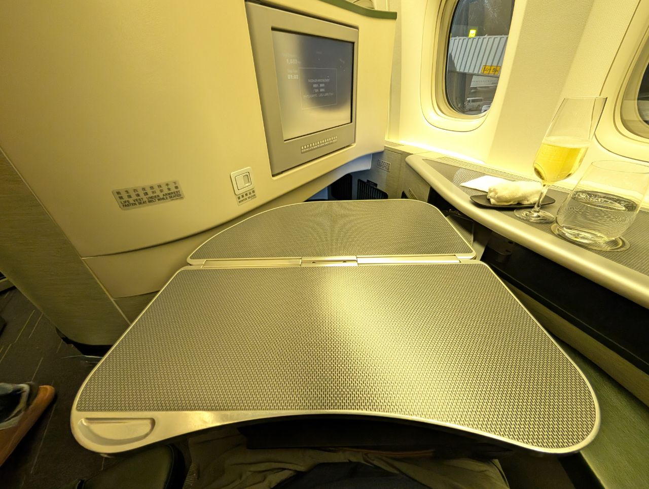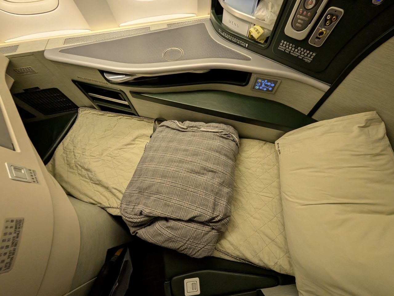 Forget about doors, 4K screens, Bluetooth audio connectivity, wireless charging, or USB-C ports. This Zodiac Cirrus seat (also used by Air France and Cathay Pacific) comes from a simpler time, when a full-flat bed was all you needed in Business. EVA has done its own customisations, but I find the colour scheme rather frumpy (checkered patterns, in 2025?), and nothing at all like STARLUX’s sleek and elegant cabins.