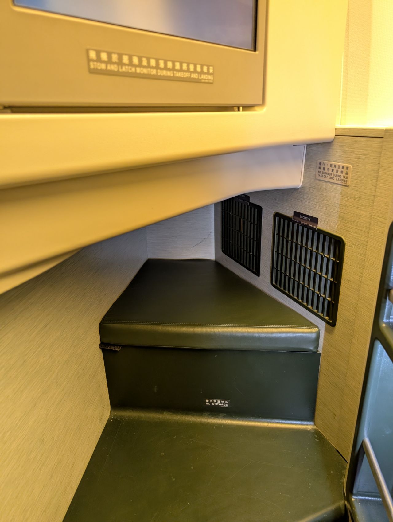 In terms of storage, a backpack could be stuffed into the footwell area, though this space can’t be used during take-off and landing (and the crew were very strict about enforcing this).