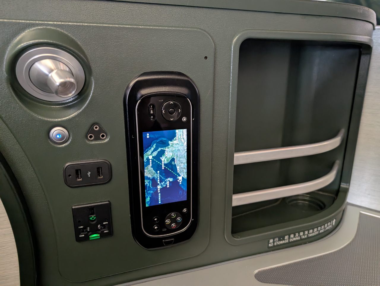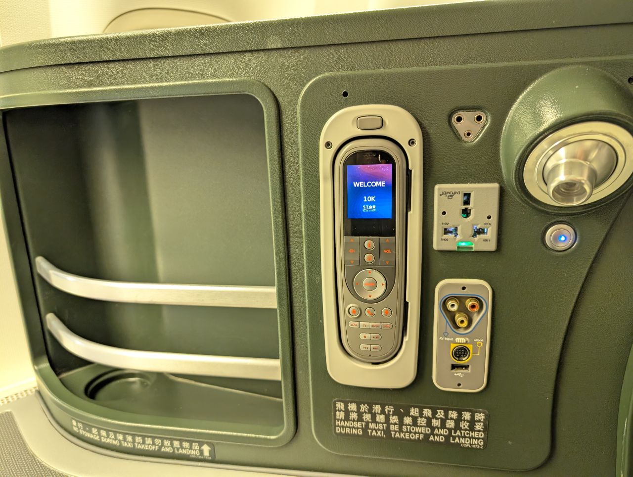 By the side of each seat was an open storage shelf with an indentation for a water bottle. However, this again could not be used during take-off and landing. There was also a button-style remote, universal power outlet, Type-A USB port and — truly revealing the seat’s age — an iPod dock and RCA A/V jacks. That’s great news, if you brought along your portable DVD player or camcorder!