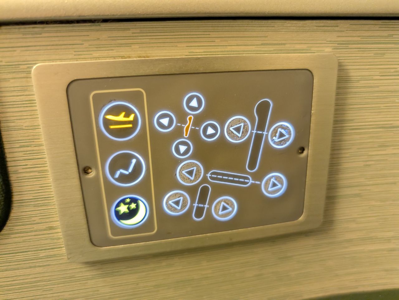 The seat control panel had presets for full flat, lounging and full upright, with the ability to control individual portions of the seat, as well as lumbar support.