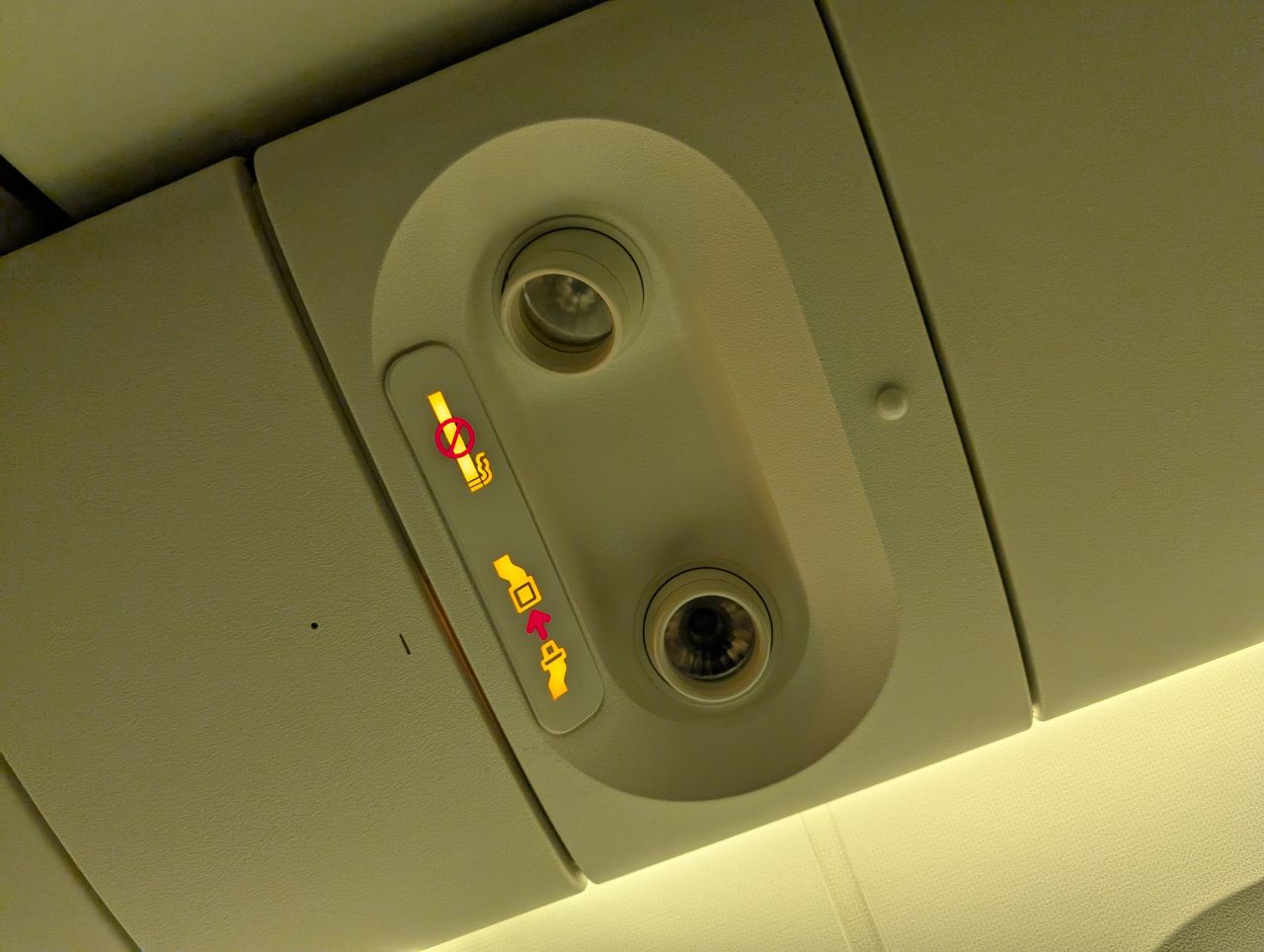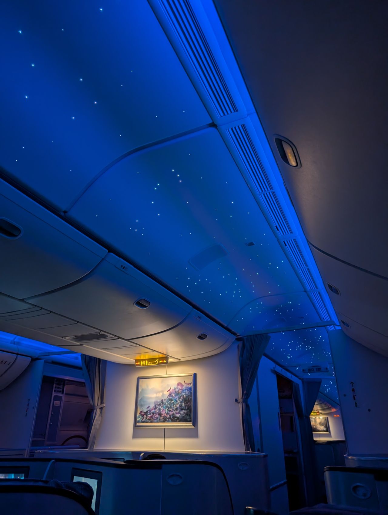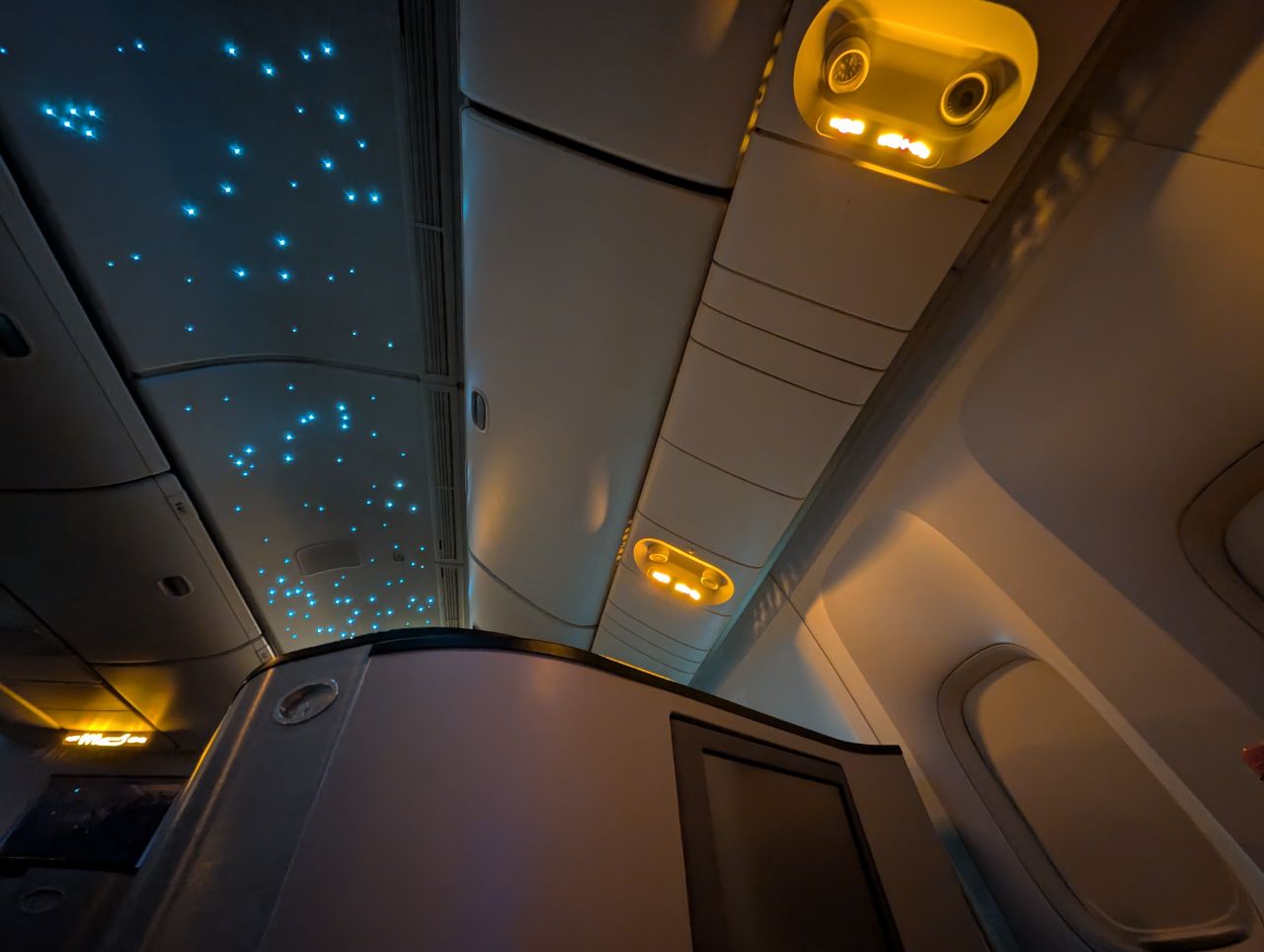 EVA opted to install Boeing’s star-like LEDs across its ceiling panels, which give the impression of watching the night sky. Some people find it cheesy, but I rather like the effect.