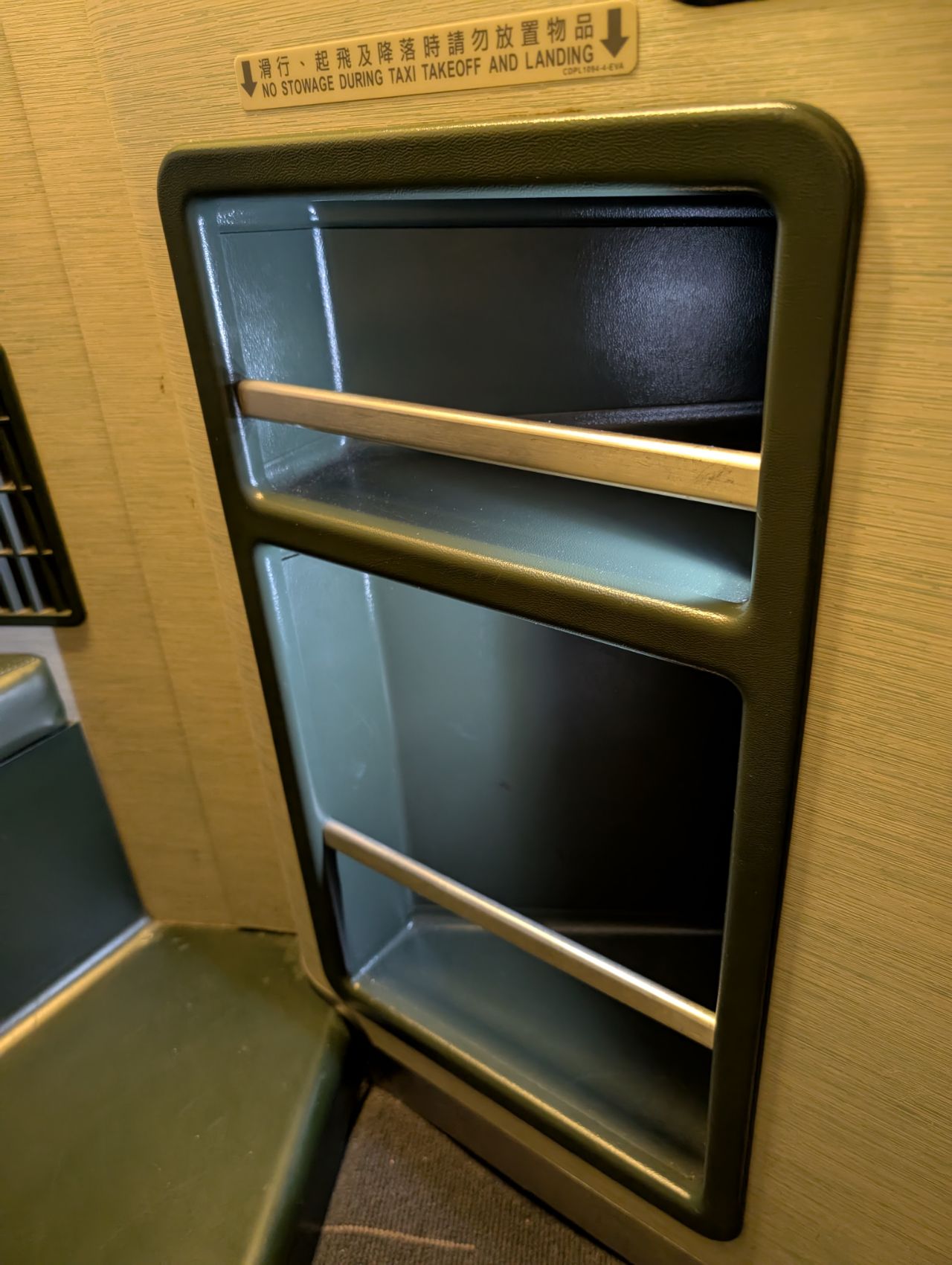 Additional stowage could be found down by your legs, but — you guessed it — it couldn’t be used during take-off and landing. So this is really an annoying design issue, in that most of your stuff will need to stay in your bag, in the overhead bin, until after take-off.