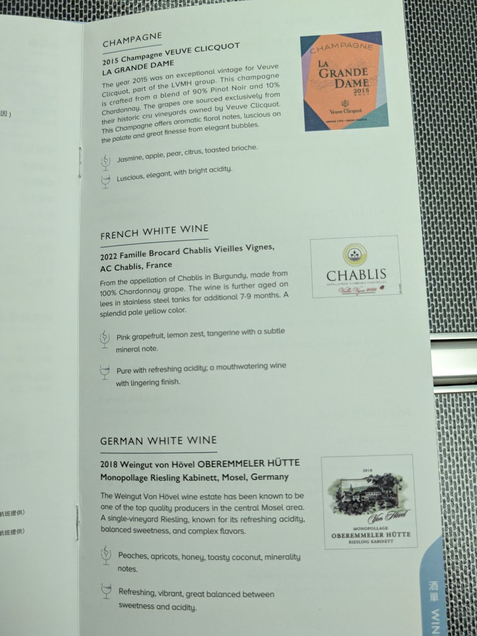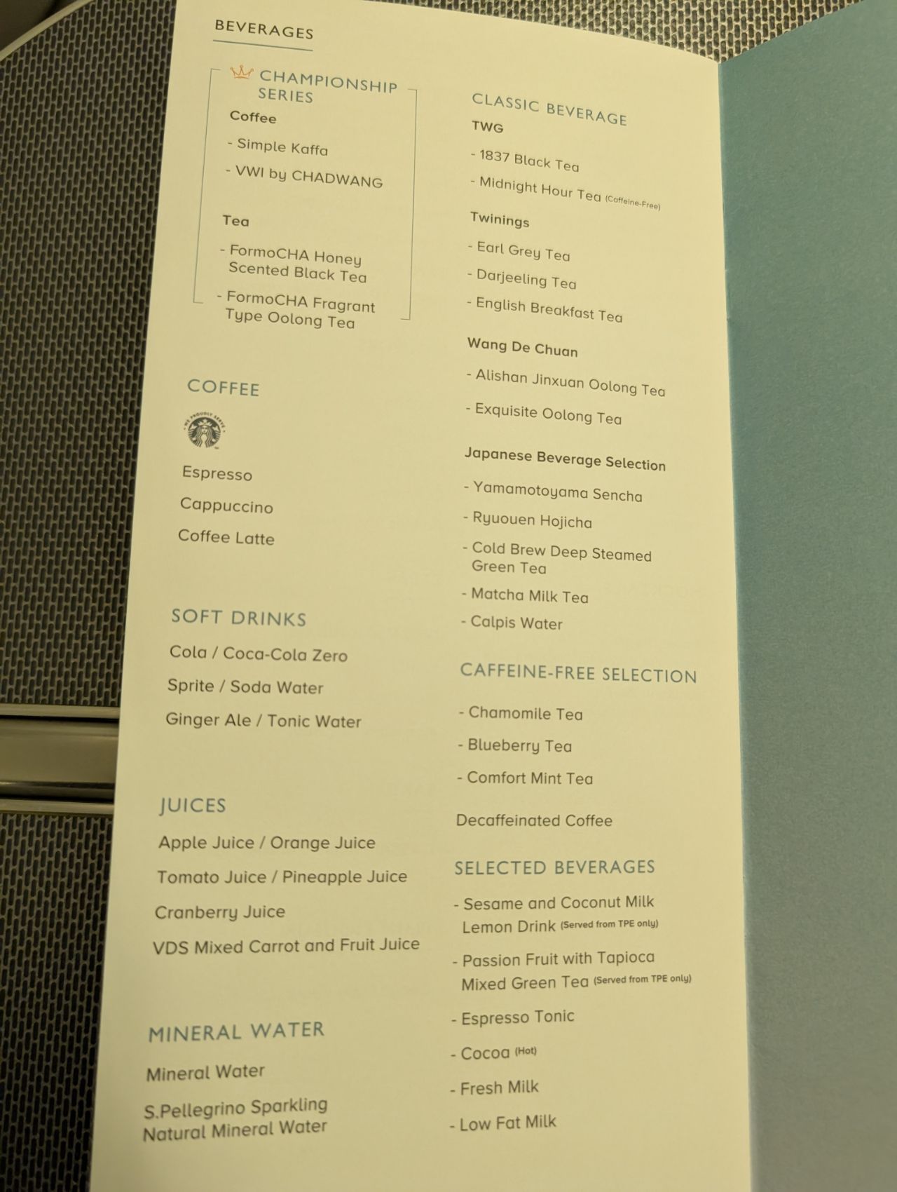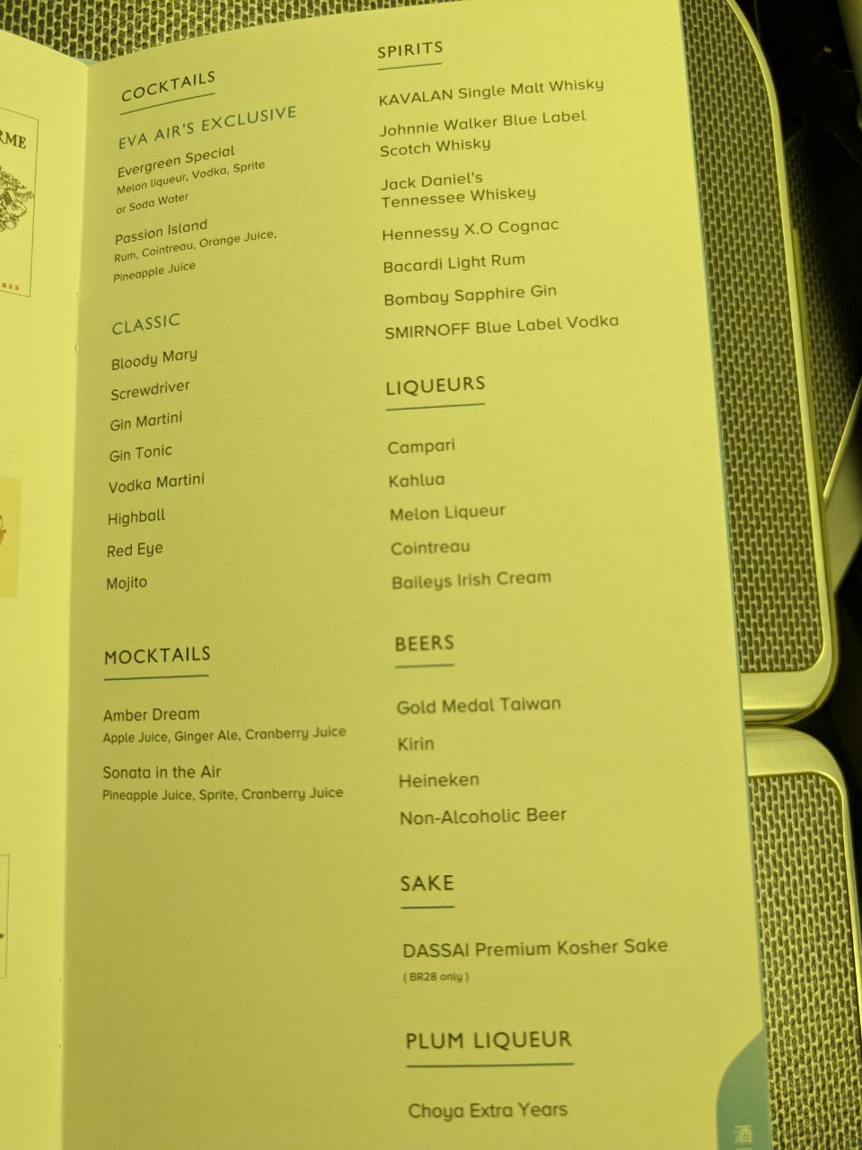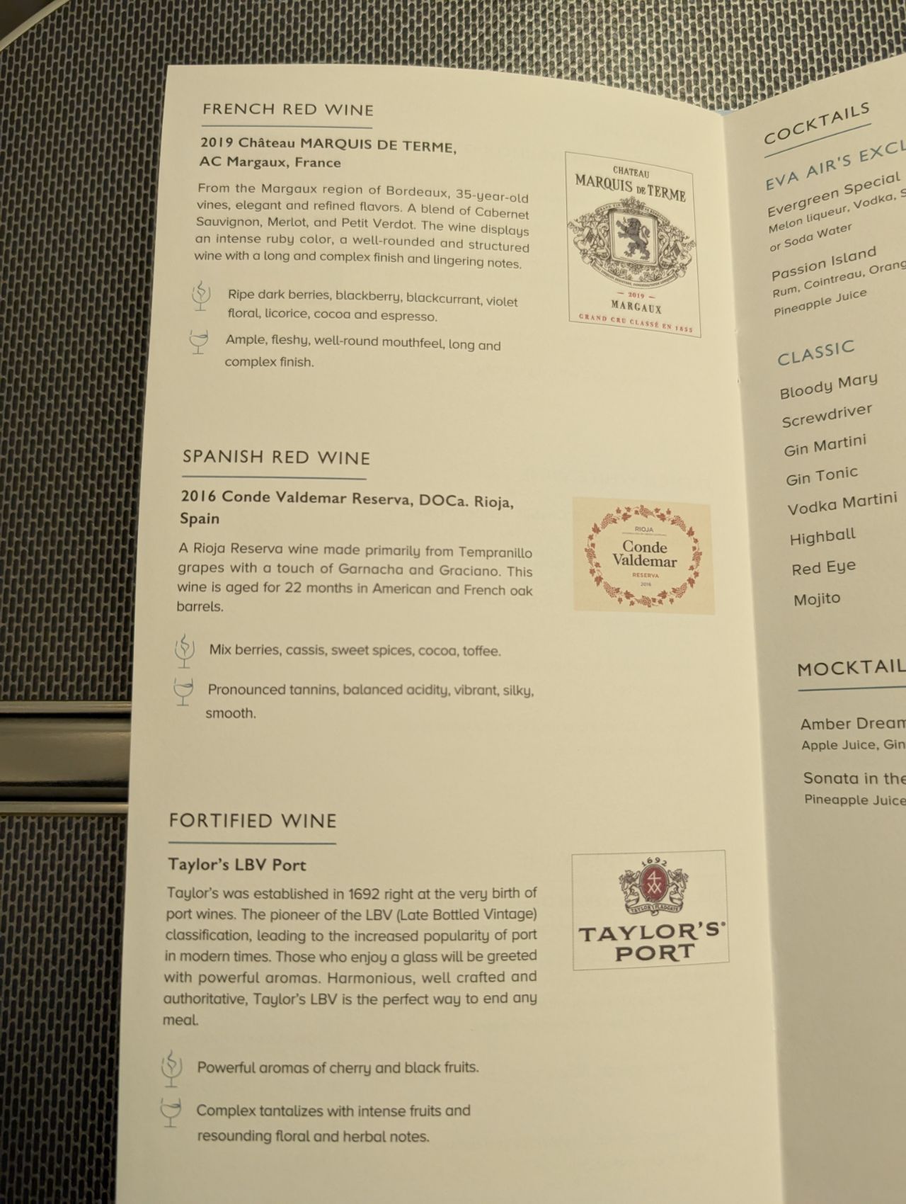 Shortly after settling in, one of the cabin crew came around to offer a welcome drink. If memory doesn’t fail, EVA Air doesn’t serve champagne on the ground. Instead, it serves a cheaper Cava, with the good stuff reserved till after take-off, for tax reasons.
