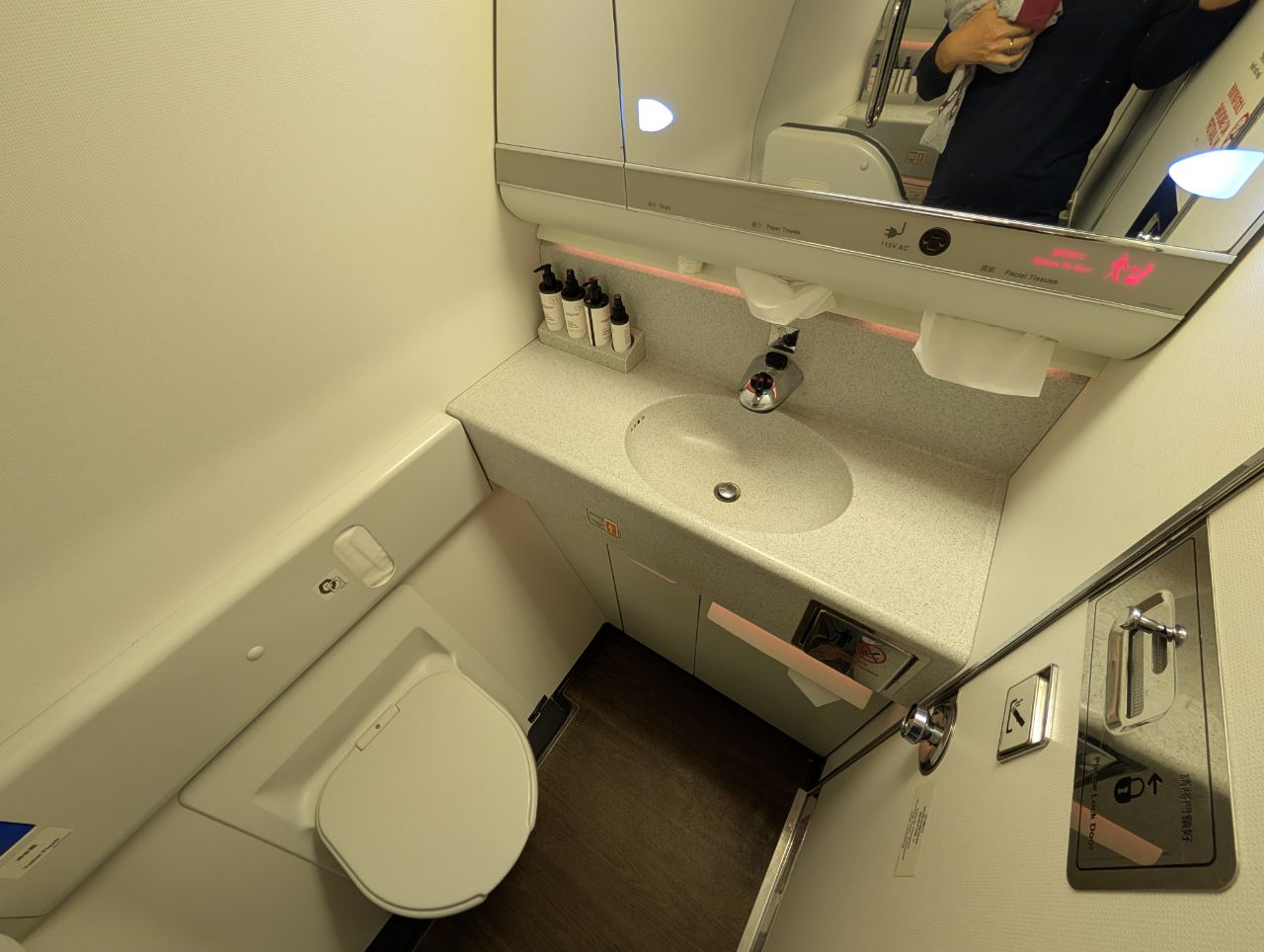 The 38 Business Class passengers share a total of three lavatories, one at the front of the cabin and two at the rear. There wasn’t anything fancy here — no spa music like on STARLUX — but at least they were kept clean throughout the flight.