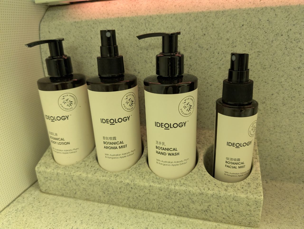 The lavatory was stocked with Ideology amenities, including body lotion, aroma mist, hand wash and facial mist.