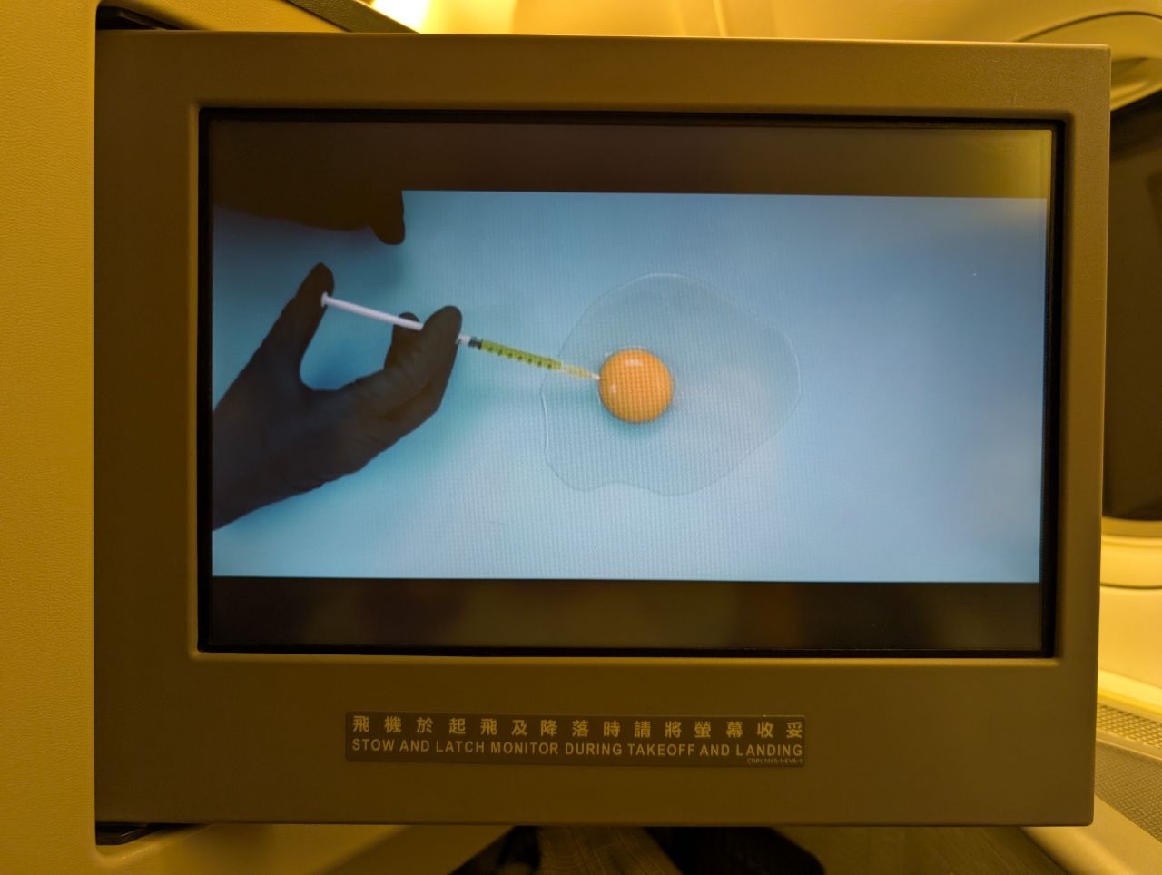 Each Business Class seat has a personal 15.4-inch entertainment screen, which had to be stowed and latched during take-off and landing. The inability to watch anything during this period felt annoying, and I saw more than a few people simply unlatching their monitors after the crew took their seats for take-off.