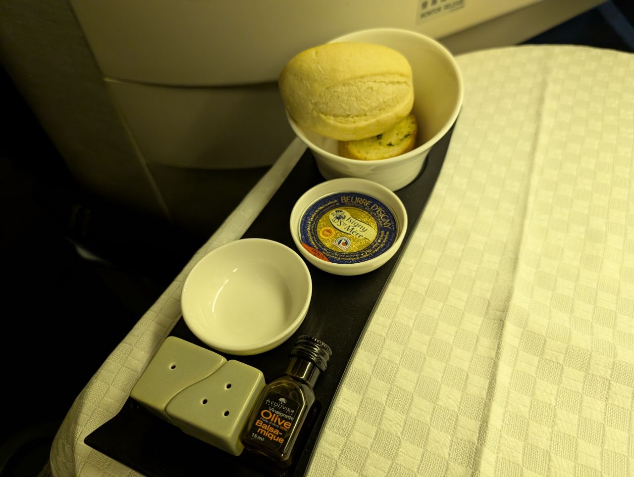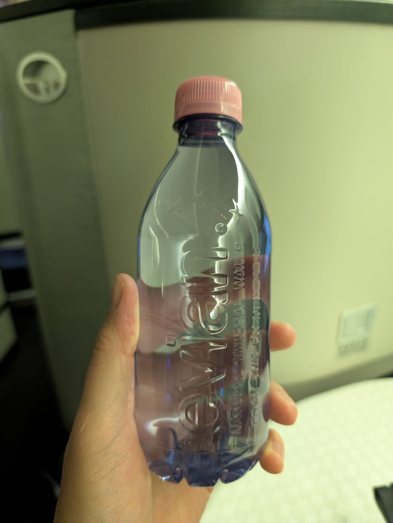 A small bottle of Evian was provided to each passenger. By the way, it’s quite common for Evian to be served without the label these days, as part of efforts to minimise plastic waste (because nothing says “save the earth” like bottled water flown thousands of miles across the globe!).