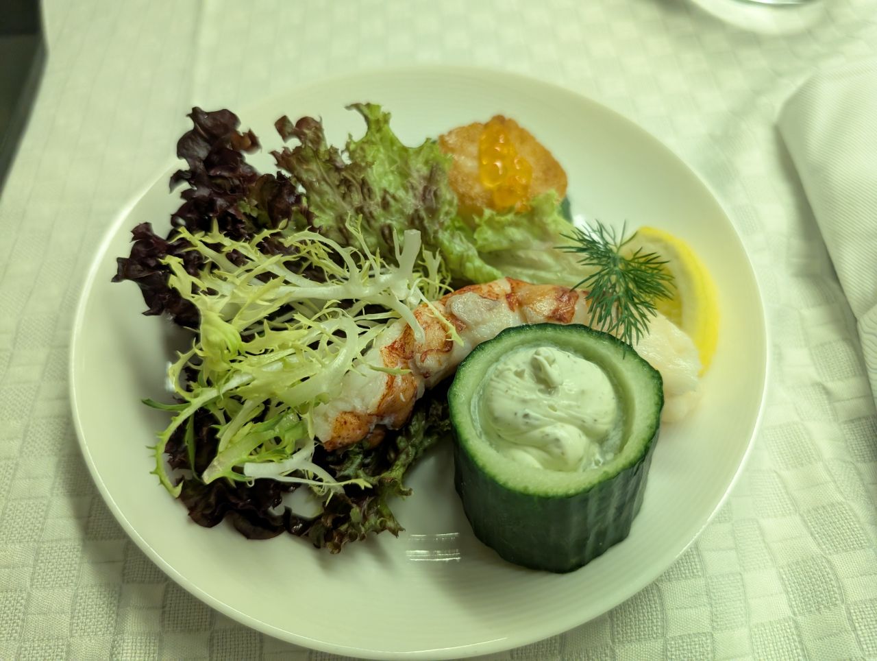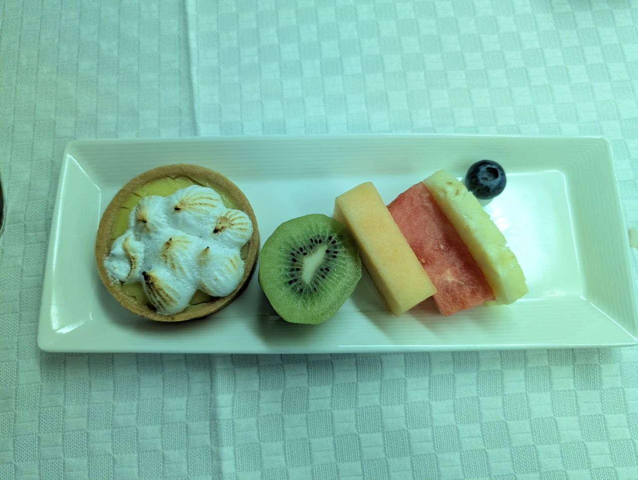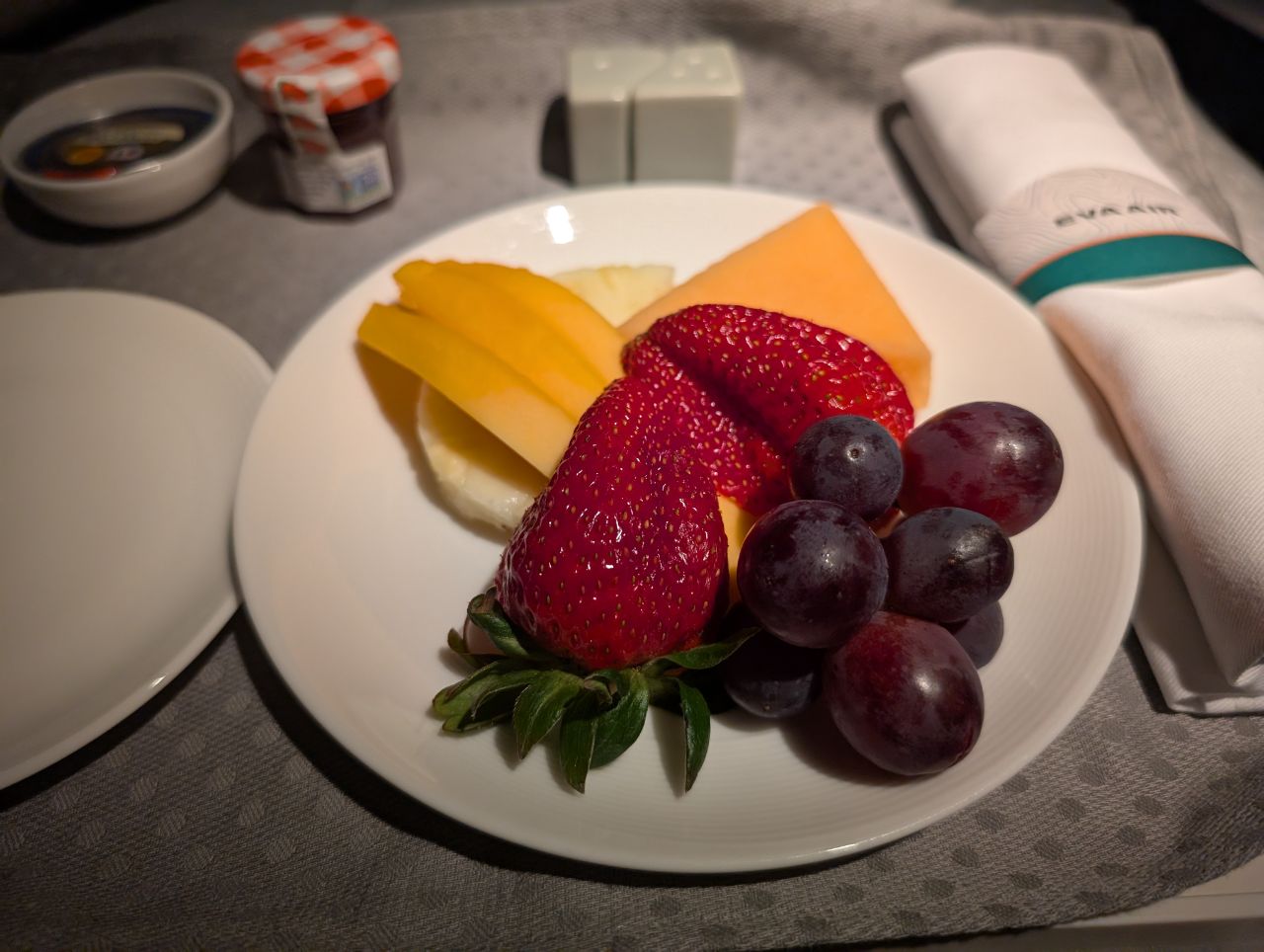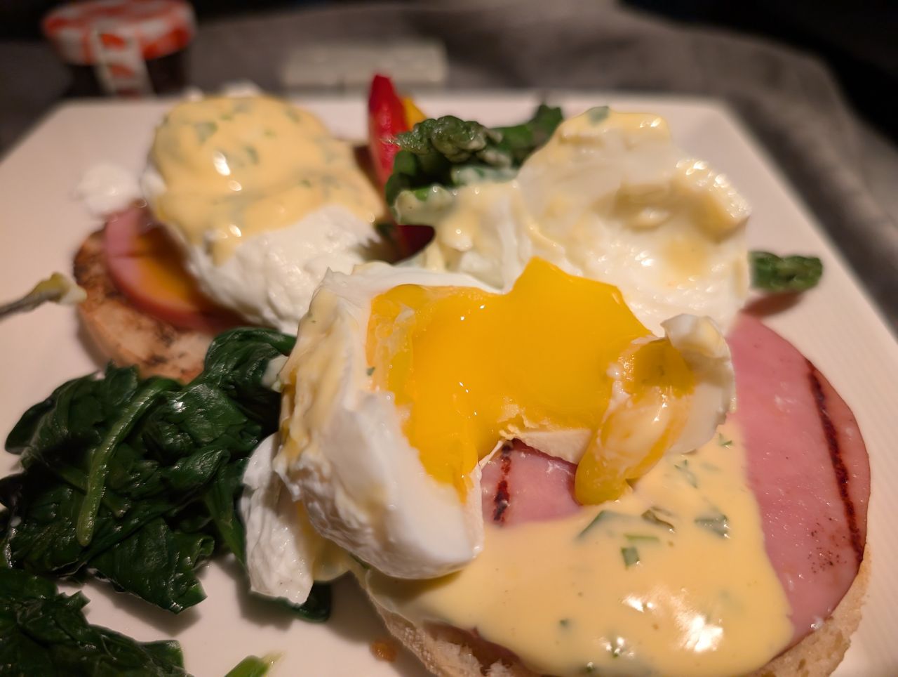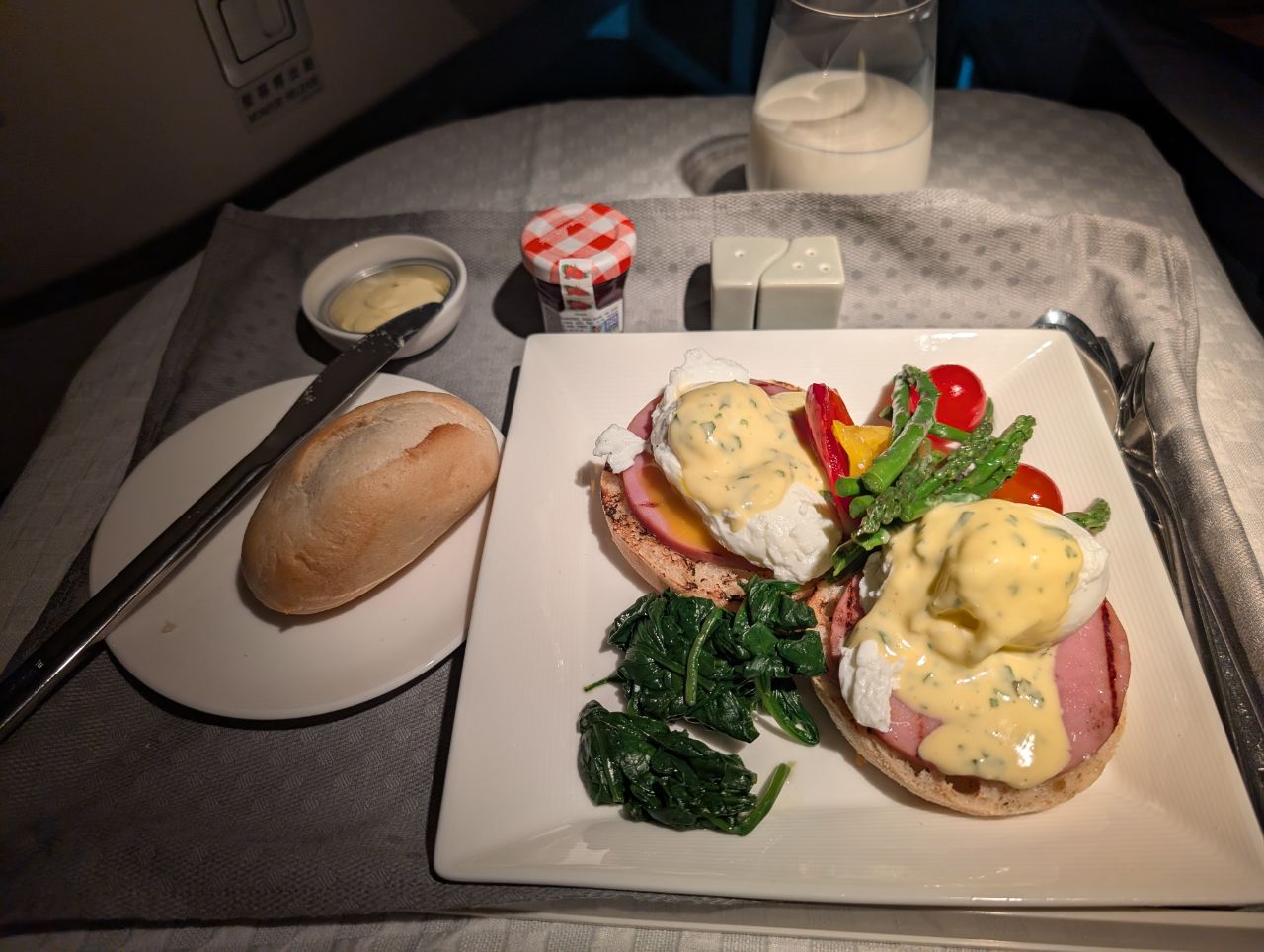 Breakfast started with a fruit plate, and for the main I chose the eggs benedict, served with bacon, grilled vegetables and sauteed spinach. I was extremely impressed the yolks were still slightly runny, and not nuked into oblivion as is often the case on airlines.