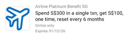 | Airline | S$100 per 6 mo. (Min. S$300 spend) |