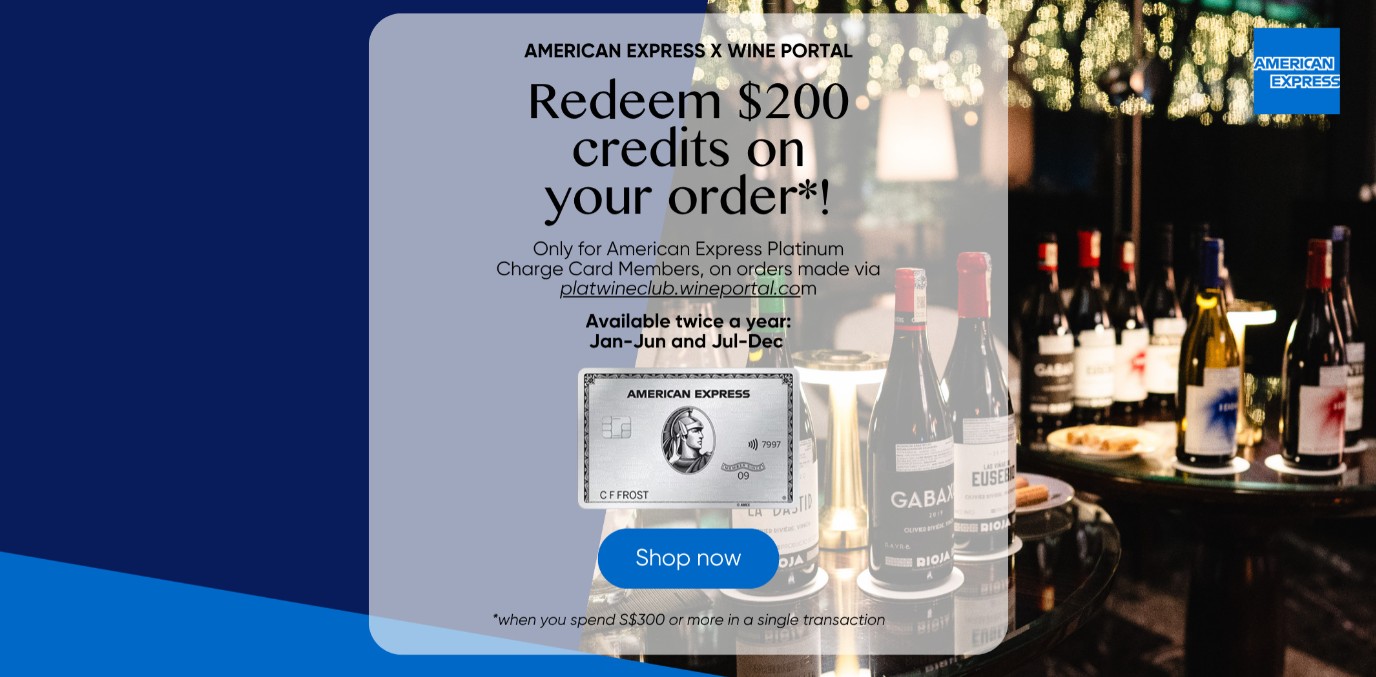 AMEX Platinum Charge cardholders receive 2x S$200 Platinum Wine credits every half-year that can be used for purchases at the Platinum Wine portal.