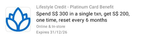 | Lifestyle | S$200 per 6 mo. (Min. S$300 spend) |