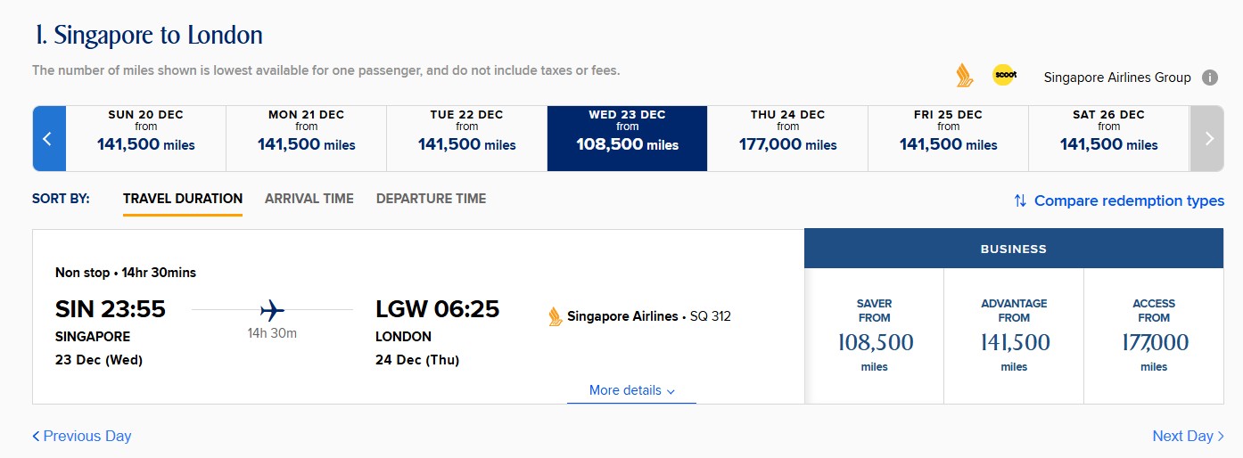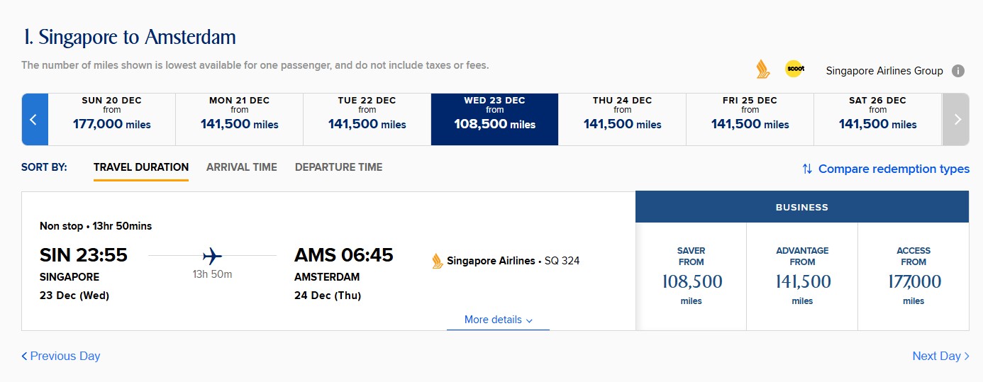 In fact, given that it’s December, I was quite surprised that as a regular KrisFlyer member, I could find 2x Business Saver awards on certain dates to places like Amsterdam, Frankfurt, and London Gatwick (where a Solitaire could even find 4x Business Savers!)