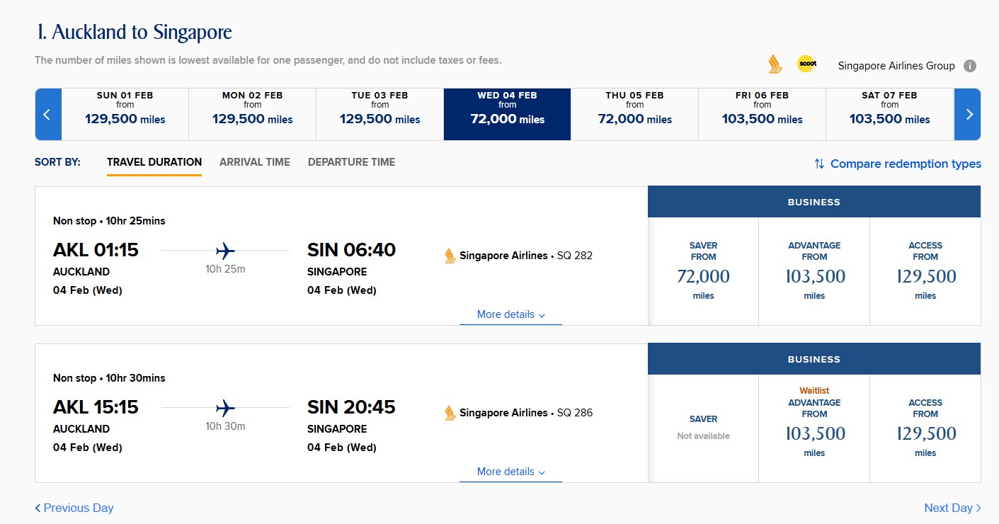 But opening to waitlist isn’t necessarily game over. In the MileChat, there are several data points from regular KrisFlyer members who added themselves to the waitlist at T-355, then cleared it a couple weeks later. Moreover, additional Saver awards can open up closer to departure. For example, a regular KrisFlyer member can find scattered Saver awards between Auckland and Singapore for travel in January and February 2026.