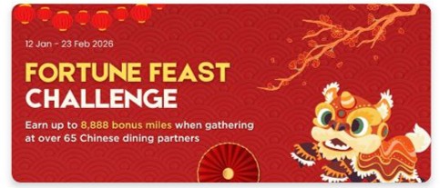 From 12 January to 23 February 2026, Kris+ users who register for the Fortune Feast Challenge will earn between 488 and 8,888 bonus miles when they spend at least S$250 at over 65 participating dining merchants across Singapore.