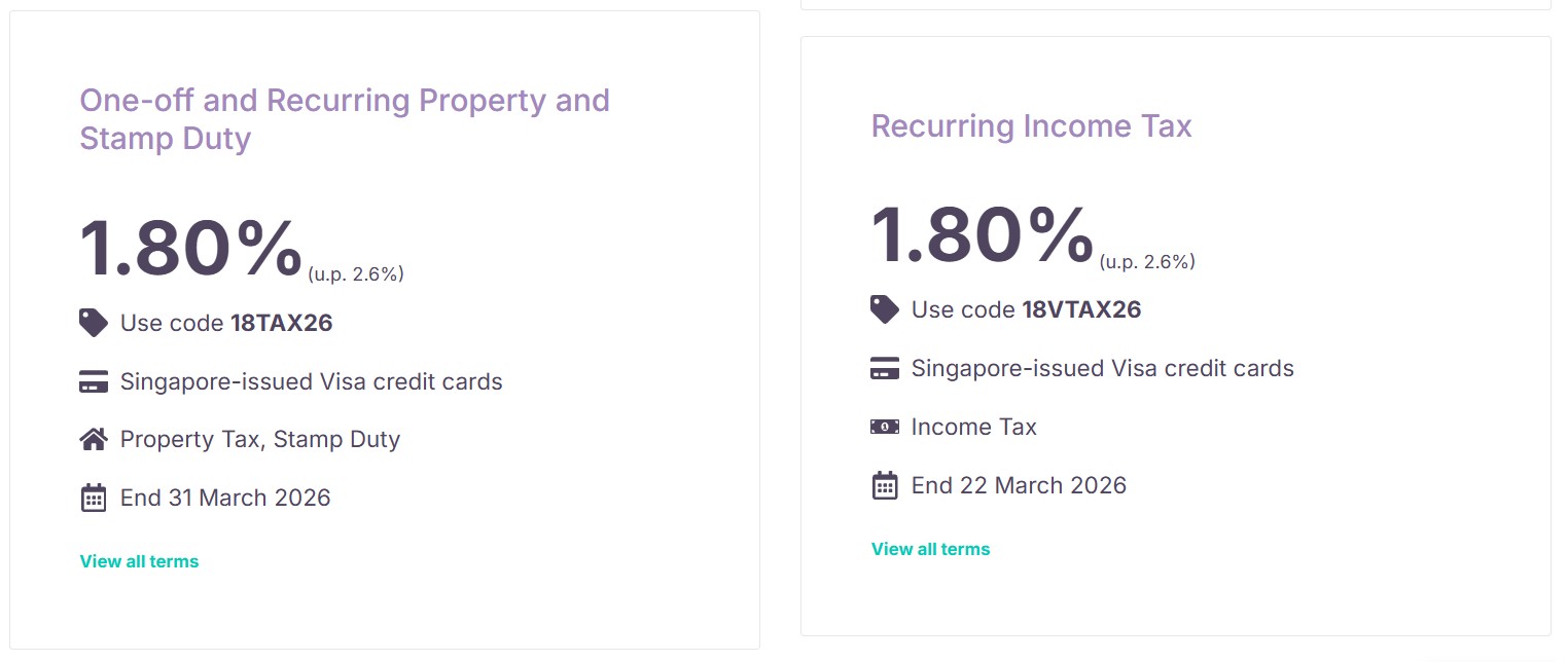CardUp customers can use the promo code 18TAX26 to enjoy a 1.8% fee for property tax (one-off or recurring) and stamp duty payments (one-off).