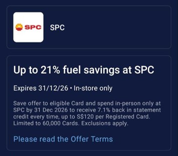 From 15 January to 31 December 2026, American Express customers can register their cards to save up to 21% off petrol at SPC.