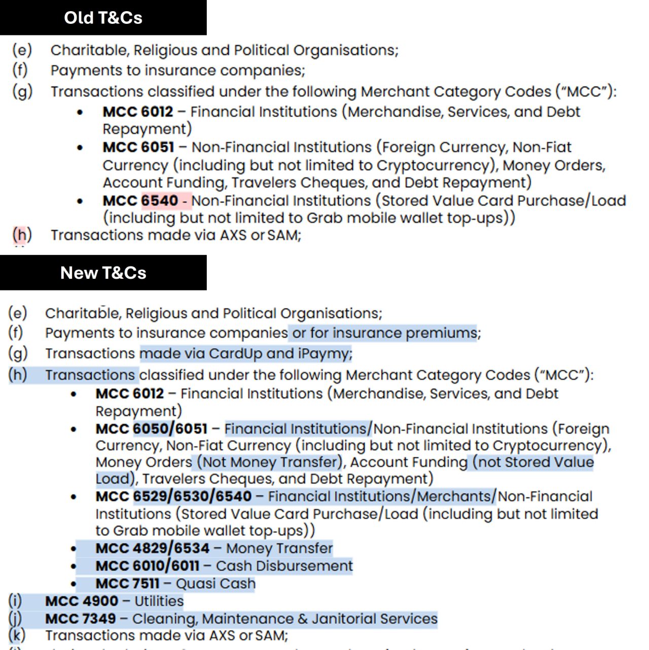I’ve uploaded both documents side-by-side here for an easier comparison, but here’s the crucial bit. While the new T&Cs largely reflect what was announced, there is an additional exclusion for CardUp and ipaymy, found at 2.2 (g), that came out of nowhere!