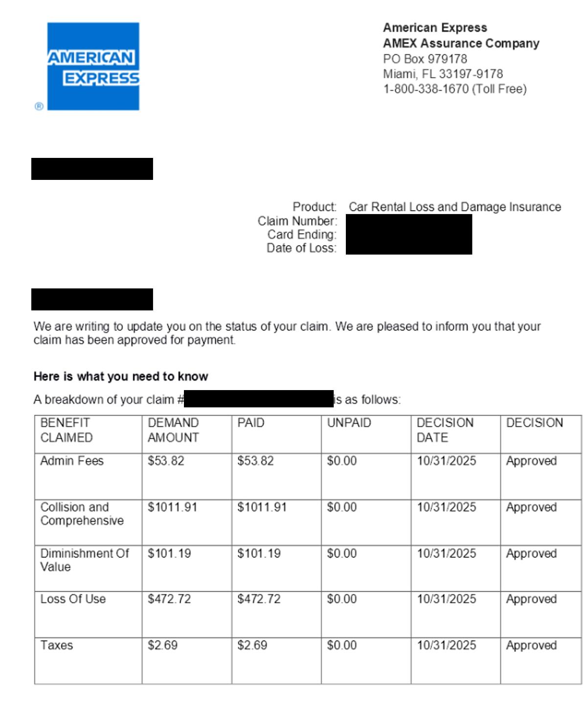 The rental company (National) sent a bill for C$2,288.75 worth of repairs and loss of use. Fortunately, my friend had paid for the rental with his US-issued American Express Marriott Bonvoy Brilliant Card, so it was a simple matter of filing a claim. A few weeks later, American Express paid the bill in full. We didn’t have to purchase CDW— in fact, if we did, then American Express coverage would not apply.