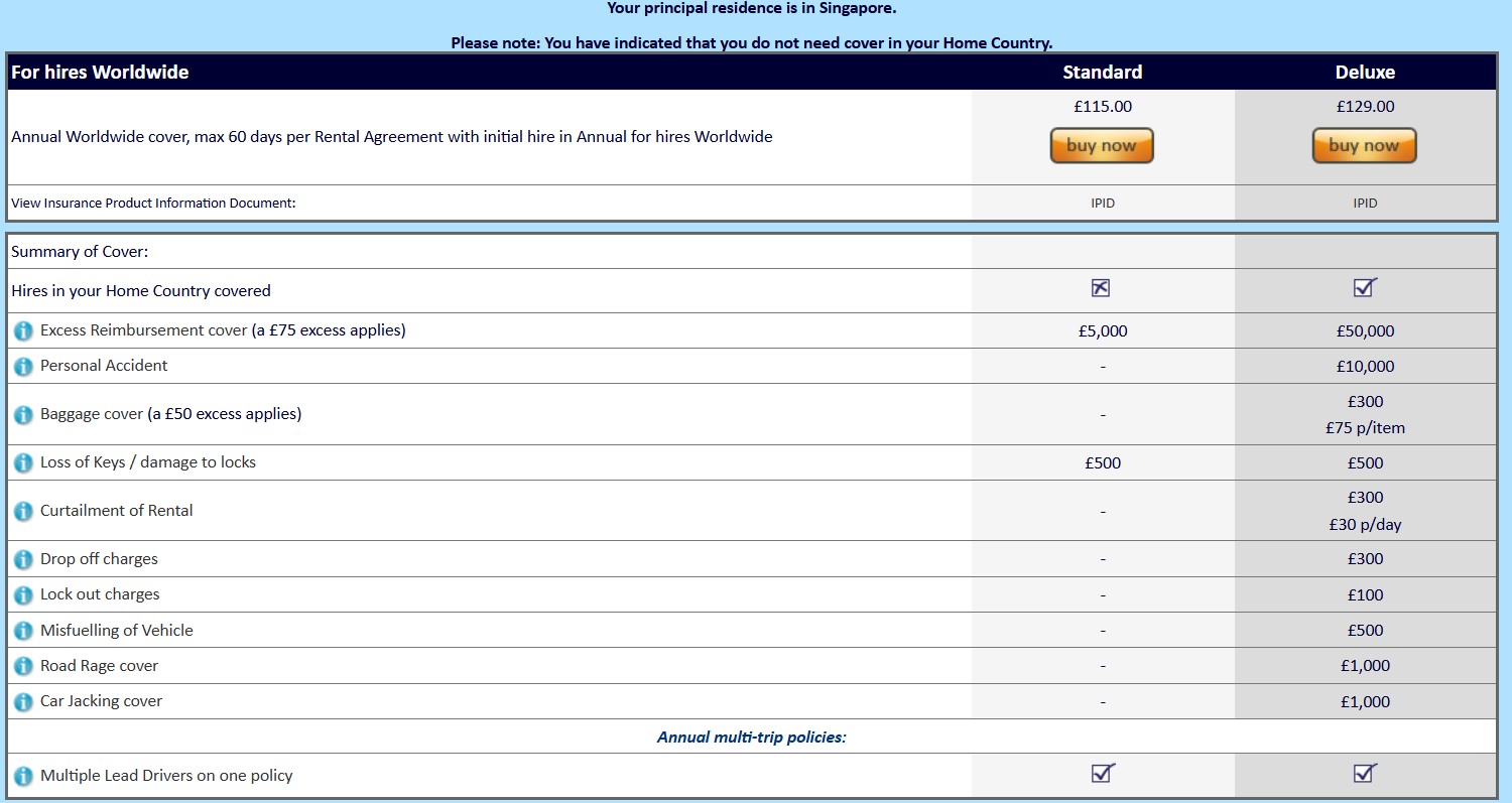 One company I’ve used before is Worldwide Insure, which offers single trip plans, or an annual plan for £129 (~S$225) that covers rentals of up to 60 days. The Deluxe tier will reimburse any excess up to £50,000 (~S$87,000), with a deductible of £75 (S$130).