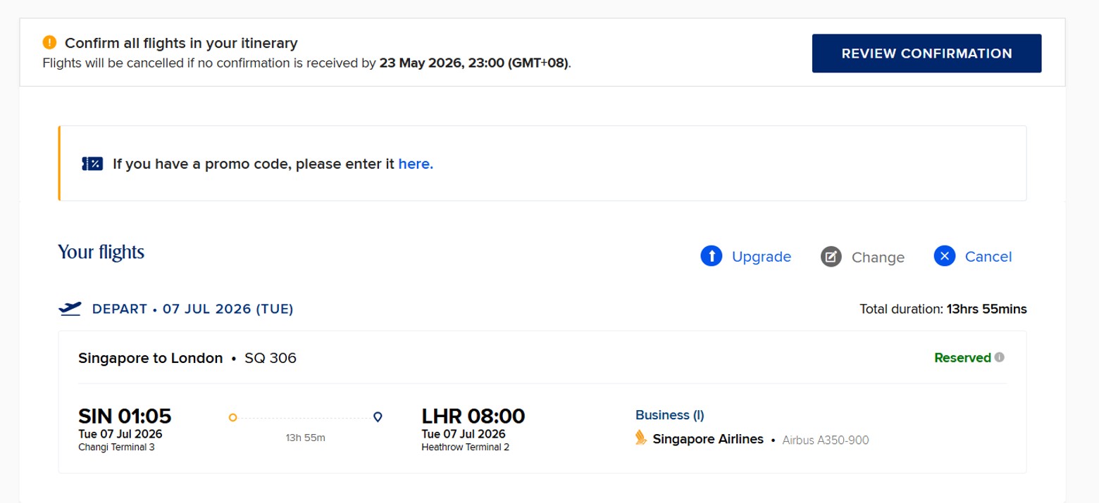 If you’re short of miles and don’t have access to any instant transfer option, it’s worth calling up KrisFlyer membership services and asking them to hold the award. What this means is that the available seats are held for you, pending the arrival of miles in your account. Once those miles are credited, you proceed to pay for and confirm those seats. The duration of the hold can vary widely, from as little as 24 hours to as long as a few months. It’s not clear how this is determined. If a hold is granted, you’ll see the itinerary appear in your KrisFlyer account with a “Reserved” label on it (as opposed to “Confirmed”, which means the seat has been paid for and is yours). It will also show when you must ticket the booking by.