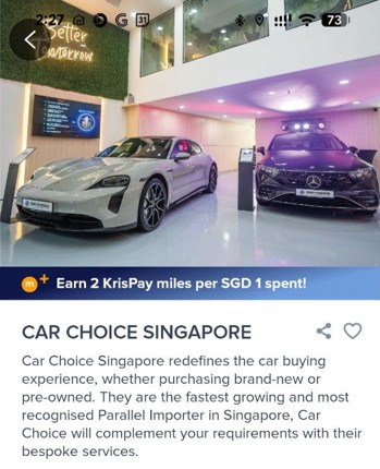 Kris+ has added its first-ever car dealership, with users now earning 2 mpd for up to S$10,000 of payments at Car Choice. While Kris+ has had auto-related businesses before like car servicing, car rentals and car grooming, this is the first time you’ve been able to buy a car through the platform.