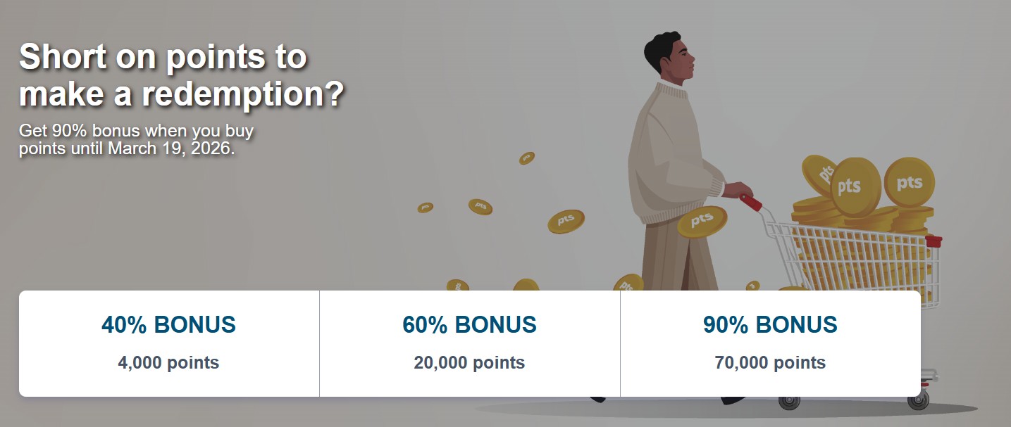 From now till 20 March 2026, 3.59 p.m SGT, Aeroplan members can buy points with up to a 90% bonus. Offers are targeted, so you’ll need to log in to your account and see what your offer is.