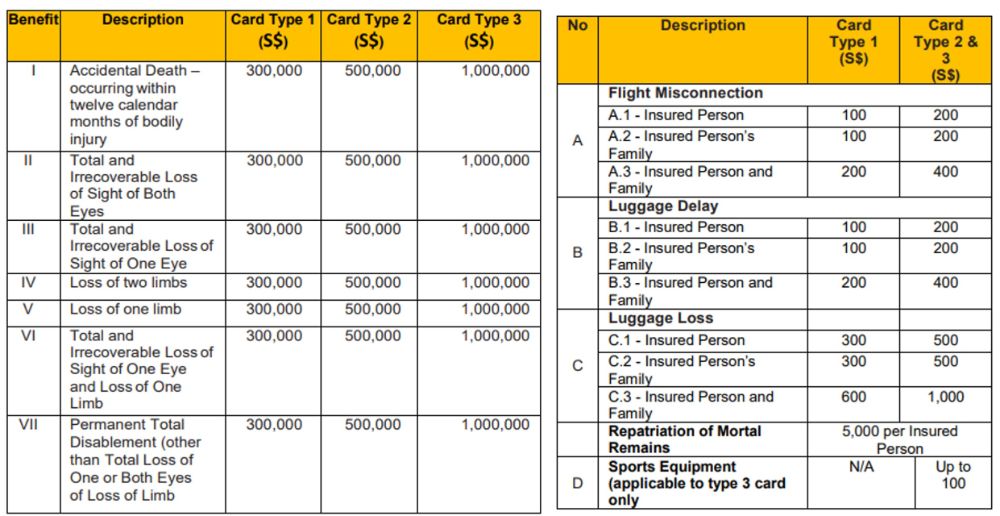 It is classified as “Card Type 2”, which means S$500,000 of coverage for accidental death, S$200 coverage for flight misconnections and luggage delays, and S$500 coverage for lost luggage, among other things.