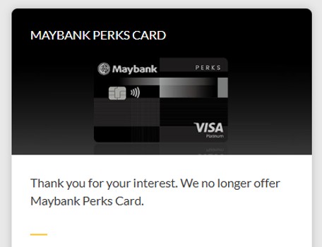 Maybank’s website, rather hilariously, says “We no longer offer Maybank Perks Card”. Um, no. What they meant to say is that they no longer offer the Maybank Horizon Platinum Visa, but someone went ahead and did a 1-for-1 swap of all card names ahead of time. |
