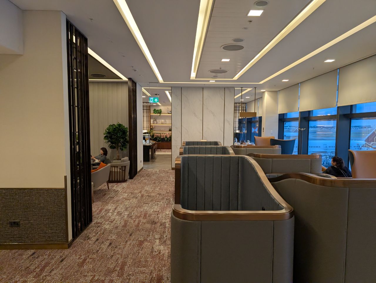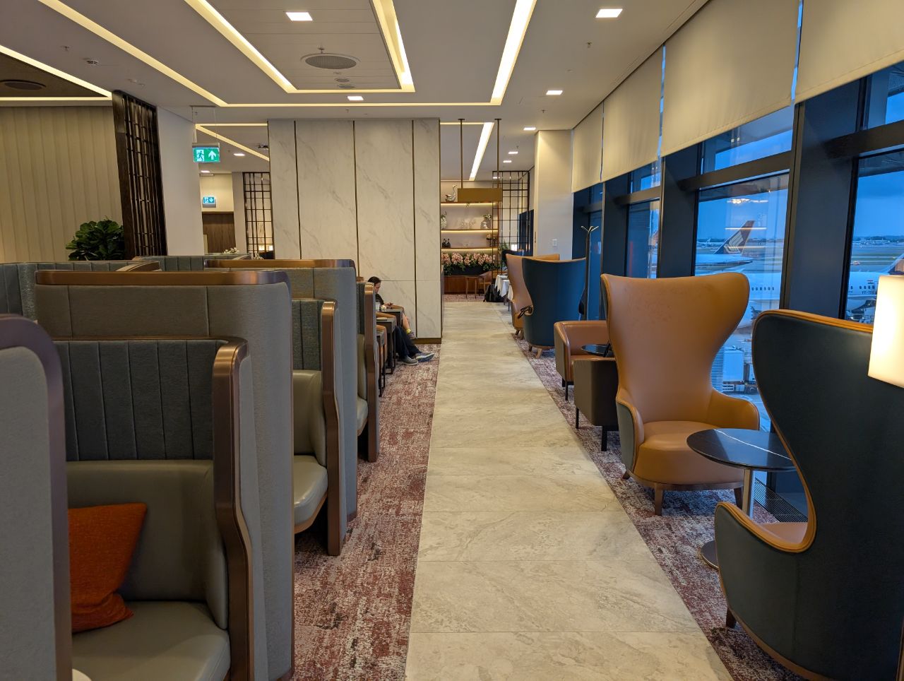 The 10,689 square feet SilverKris Lounge is divided into First Class and Business Class sections, with First Class on the left of reception, and Business Class to the right. There is capacity for 242 customers, split into 50 in First Class and 192 in Business Class.