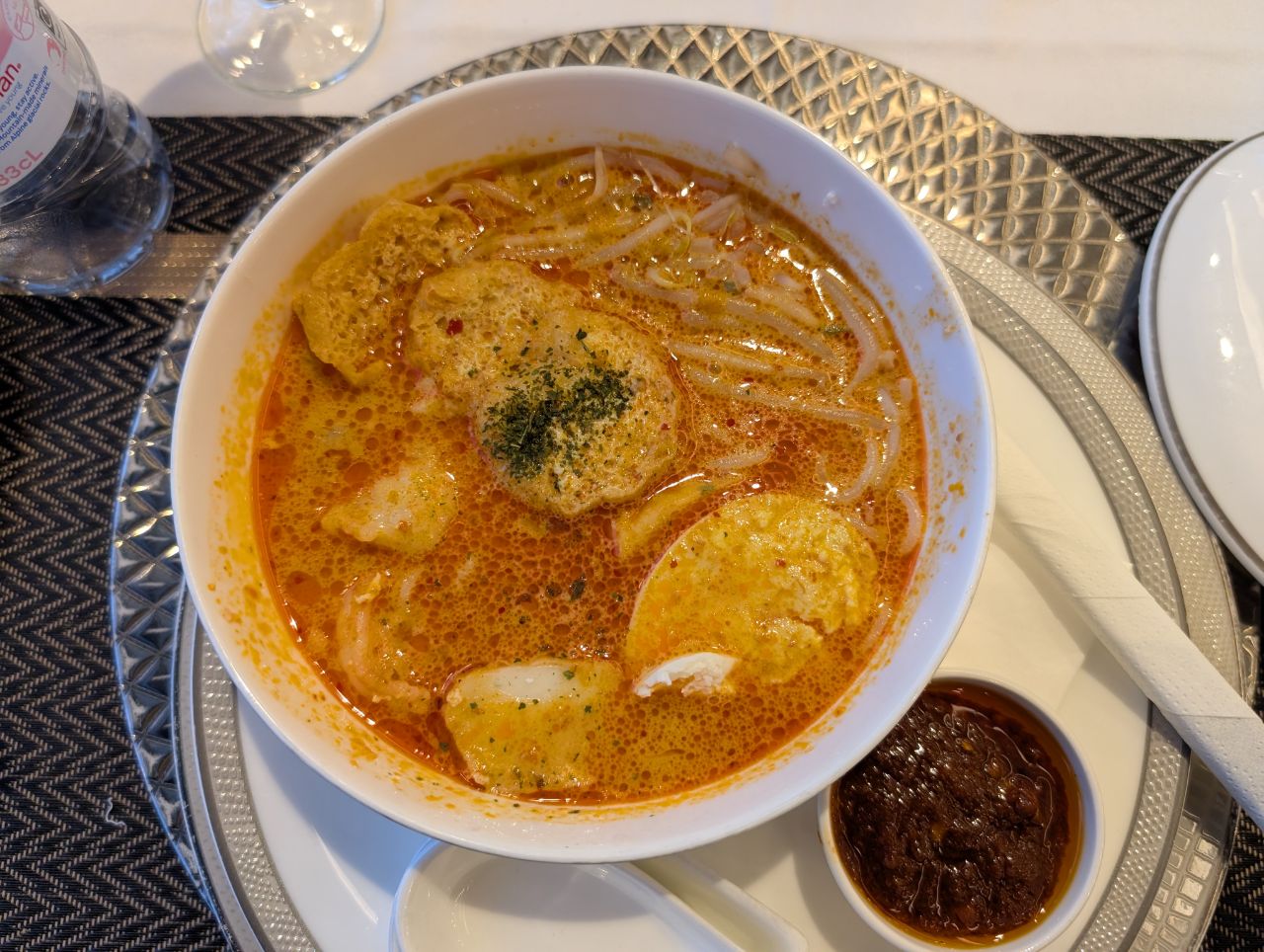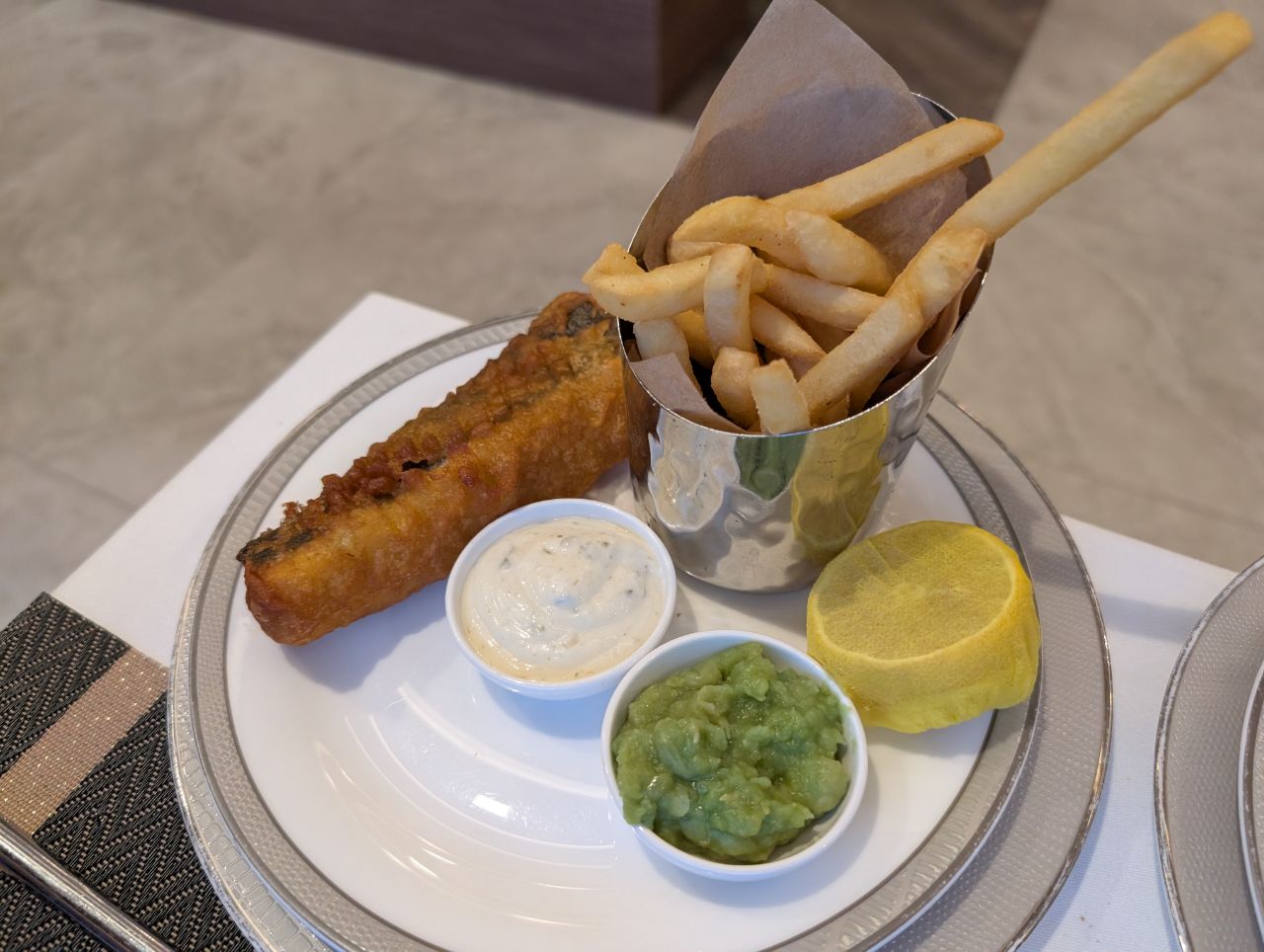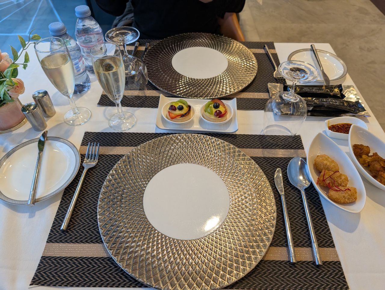 The dining experience was very pleasant, with show plates, cold towels before and after the meal, and proper wine and champagne flutes.