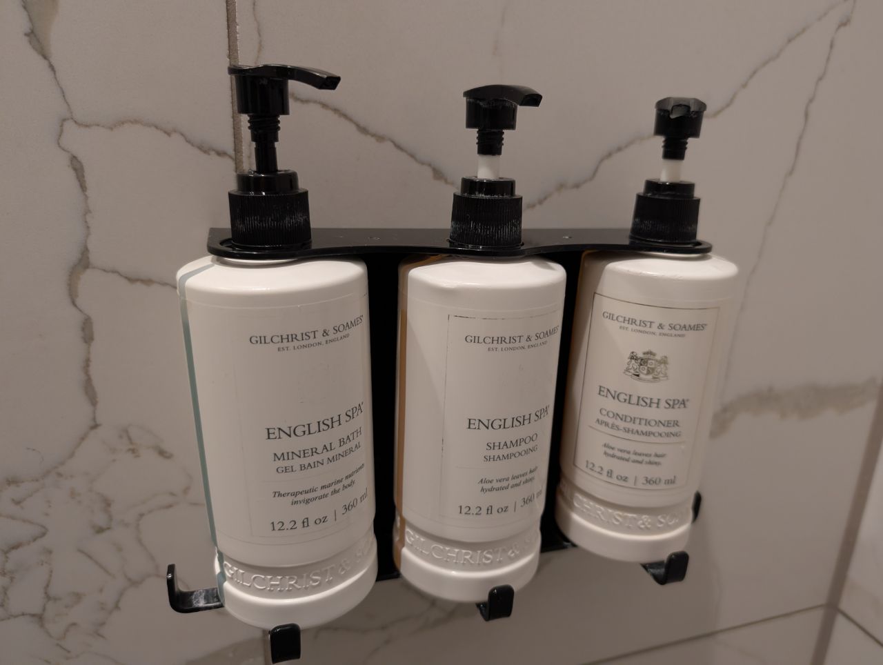 The shower cubicle had an oversized rain showerhead, paired with a hand shower with a button-activated mixer. Wall-mounted Gilchrist & Soames toiletries were provided.