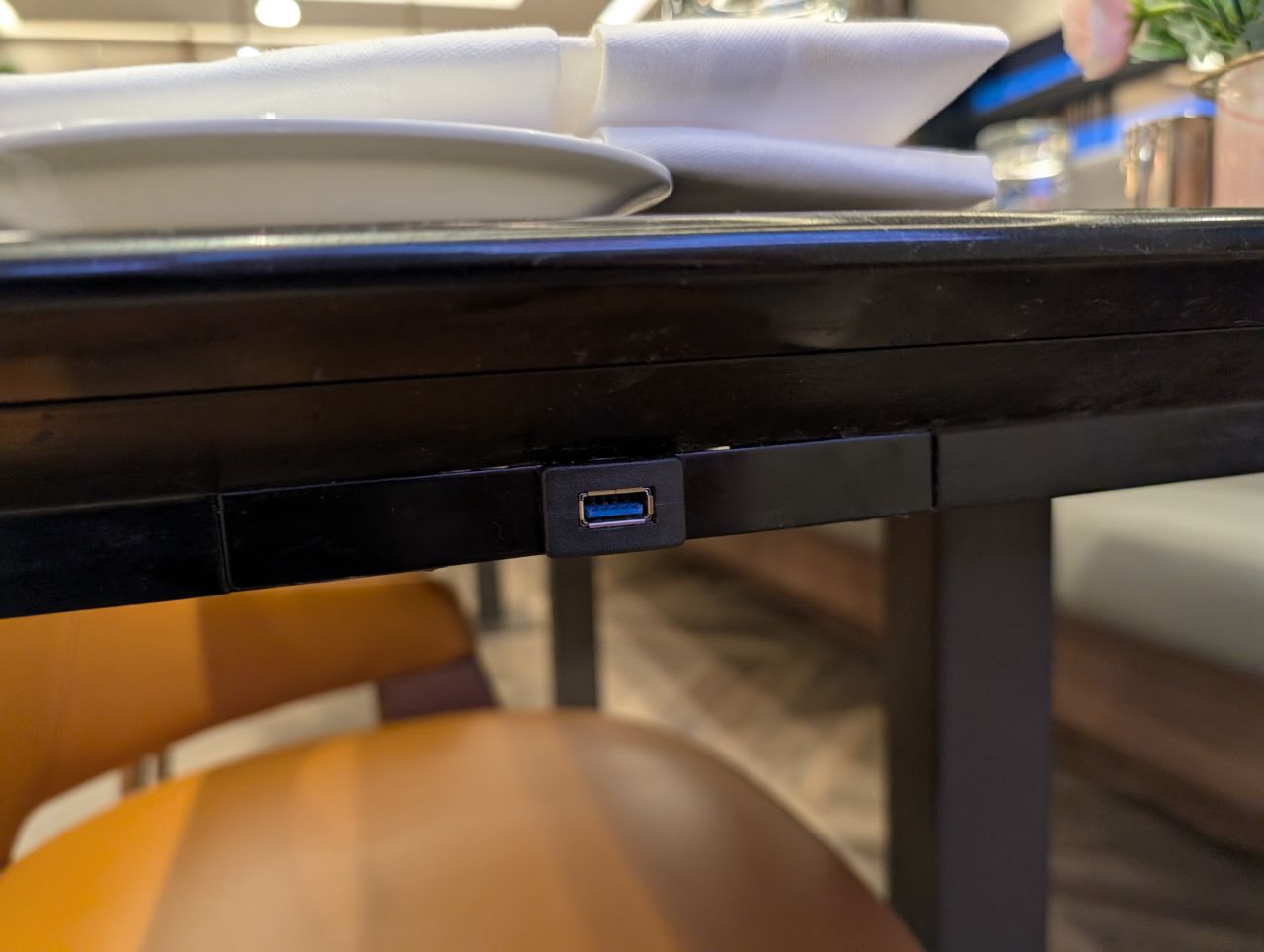 You’ll even find charging outlets in unexpected places, like beneath the dining tables! I didn’t see any wires running along the ground, so I can only assume the table sits on top of the outlet itself.