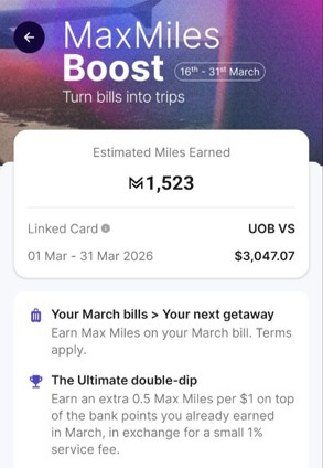 Max Miles Boost allows users to purchase a lump sum of Max Miles, based on the spending on their HeyMax-linked card during March 2026.