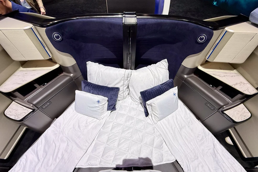 At a pop-up event in Brooklyn last year, United showed a mock-up of the double bed arrangement in the rear cabin. I particularly like that they’ve created an additional mattress pad to cover the privacy divider, which helps to sell the illusion better (that said, the hard materials used for partitions mean it won’t be comfortable to lie across two seats).