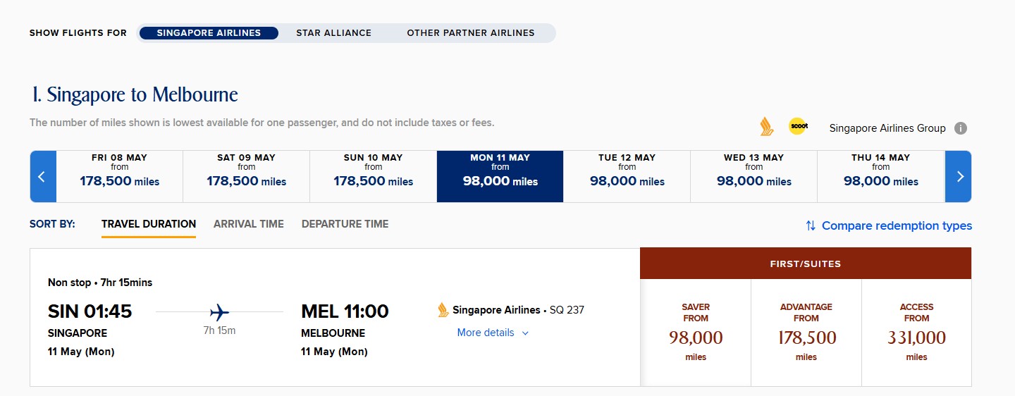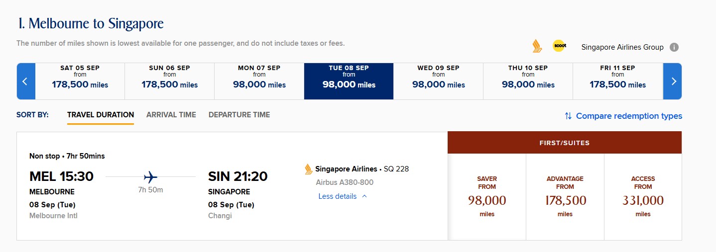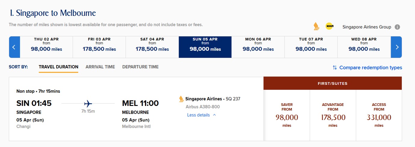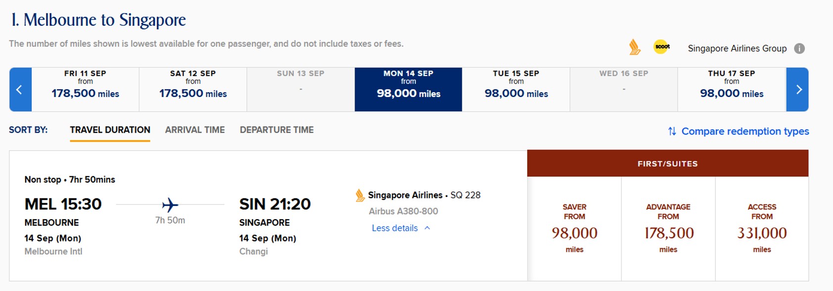 But what’s interesting about the Melbourne redeployment is that I’m seeing sporadic instantly-confirmable Suites Savers, priced at 98,000 miles each way.